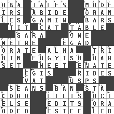 ACROSS 1. Chief or king in Benin or Nigeria 4. Falsehoods 9. Method 13. Big collection agency 14. Remain 15. Northwest Algerian city 16. French article 17. Homeless child 18. Taverns 19. Teat (slang) 21. Domesticated feline 22. Eating place 24. "Two Mules for Sister ____" 26. Single 27. Distance measurement (Brit.) 29. Mild oath 30. Speak pompously 31. _ mater 33. Three (prefix) 36. Storage container 37. Out of fashion; old fashioned 40. Rowing implement 41. Put into a specified state 42. Rendezvous 43. Related on the mother's side 45. Armor plate that protects the chest 47. Amusement-park features 48. Large container 49. United States Postal Service (abbr.) 50. Seines 52. Prohibit 54. R.R. building 56. Drawstring 57. Ms. Damita and namesakes 59. Sep. follower 61. Otherwise 62. Proofreads 63. Mouth or opening 64. Wrote a lyric poem 65. First name in cosmetics 66. Directed DOWN 1. Lubricate 2. Cy Young winner Saberhagen 3. Aide 4. Label 5. Phillipine bananalike plant 6. Pale green bean 7. Prepare for publication 8. Elected rep. 9. Crowded into 10. Spoken 11. Have the gumption 12. Followers of ems 20. Small pie 22. Ancient Roman robes 23. Santa ___, CA 25. Coral collection 27. Disorderly crowds 28. One of the Great Lakes 29. Send forth 31. Eras 32. Potassium hydroxide 33. Inedible or poisonous agaric 34. Assign a rank or rating to 35. Angers 38. Leaves out 39. Possessive pronoun 44. Cuts off 45. Dodged 46. Separate the seeds from cotton 49. Join together 50. Exchanged or delivered for money 51. Celtic language 52. Auction offers 53. Came down and settled, as after flight 55. Land measure 56. Corporate head (abbr.) 57. Area sheltered from the wind 58. Compass dir. 60. Small amount or degree