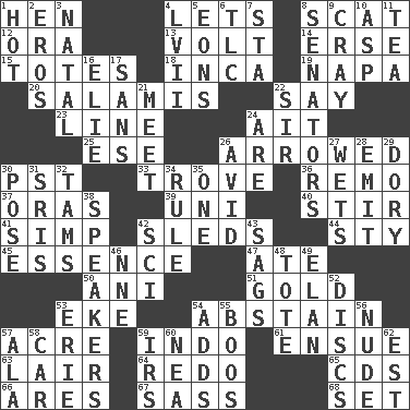 ACROSS 1. Layer 4. Allows 8. Scram, to a cat 12. Mouth or opening 13. Electrical Unit 14. Celtic language 15. Lugs 18. South American Indian 19. California wine valley 20. Deli grouping 22. Declare 23. Actor's bit 24. Small island 25. Compass dir. 26. Moved like an arrow 30. Pacific Standard Time (abbr.) 33. Collection of objects 36. San ____ (Riviera town) 37. Mouths or openings 39. Corn or form start 40. Move through with a circular motion 41. Simple or foolish person 42. Bobsleighs 44. Filthy place 45. Gist 47. Had dinner 50. Cuckoo 51. Gilt 53. Make supply last 54. Refrain by choice 57. Measure of real estate 59. _ china 61. Take place subsequently 63. Den 64. Do over again 65. Music discs 66. Ancient Greek god of war 67. Backtalk 68. Arrange properly for use DOWN 1. Being at a high temperature 2. Greek god of love 3. Relating to or accompanying birth 4. 57 in ancient Rome 5. Immeasurably long periods of time 6. Affectionate concern, for short 7. R.R. building 8. Legislators 9. Supercomputer manufacturer 10. Viper 11. Beverage made from leaves 16. Writer Wiesel 17. Without 21. Confront 22. Title for a knight 24. "We ___ not amused" (Victoria) 26. Enthusiastic 27. Soaks 28. Give off 29. Dinghy 30. Airs 31. Indian titles of respect 32. Scottish caps 34. Court order 35. Single 38. Orators 42. _-fi 43. Settles 46. Compass dir. 48. Haul 49. Enthusiasm 52. Flat circles 53. 4th largest of the Great Lakes 54. Does sums 55. Expressions of contempt or scorn 56. Unadorned 57. In the manner of 58. 4-wheeled motor vehicle 59. Big collection agency 60. Teachers' org. 62. Eastern Standard Time (abbr.)