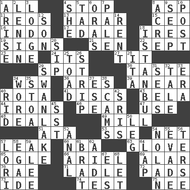 ACROSS 1. Everything 4. Constrict 8. Cleo's killer 11. Vintage cars 13. Ethiopian city, capital of Harari 15. Corporate head (abbr.) 16. Southeast Asian peninsula 17. Peak District village in England 18. Angers 19. Attaches a signature 21. Elected rep. 22. Back-to-school mo. 23. Compass dir. 24. ___ a Wonderful Life 27. Teat (slang) 29. Specific locale 30. Clothes sense 34. Compass dir. 36. Ancient Greek god of war 39. Approach 40. Roll call or roster of names 41. Flat circles 43. Actor Lugosi 44. Metal shackles 46. Lightbulb-shaped fruit 47. Purpose 48. Allots cards 49. Place where flour is made 51. _ moment's notice (2 wds.) 53. Compass dir. 54. Fish or hair follower 57. Path through which fluid escapes 60. Basketball assoc. 63. Michael Jackson trademark 65. Stare 66. Satellite of Uranus 69. Having or resembling wings 70. Actress Charlotte 71. Dipping utensil 72. Writing tablets 73. Binary compound 74. Trial 75. Born DOWN 1. Ascend 2. Soviet premier 1918-24 3. Cabin 4. A female animal or person 5. Small boy 6. Mouths or openings 7. Diluted with white 8. 43,560 square feet 9. Ooze 10. Mail 12. Boy, to dad 14. Monthly bill 18. Byzantium, centuries later 20. Small drink 25. Frog relative 26. Long narrow piece of something 28. Call ___ day 29. Tchaikovsky ballet 31. Perceives with the eye 32. Falsehood 33. Epoch 34. Had on 35. Portico 37. Compass dir. 38. Fraudulent business schemes 40. To free from 42. Indian titles of respect 45. Fast jet (abbr.) 50. Part of a journey 52. Of or related to the anus 54. Pitcher Ryan 55. Dodge 56. Laconic 57. Australian parrot (variant) 58. Mild oath 59. Toward shelter 61. Naughty child 62. Helper 64. Infant locale 67. Raised railways 68. Allow