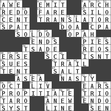 ACROSS 1. Deep reverence 4. Send forth 8. Bowlike part 12. Make new 14. Conductor's collection 15. Grain storage tower 16. Penny 17. Interpreter 20. Argument over a trivial matter 21. ___ good deed 22. Accounting whiz (abbr.) 23. Twentieth part of a lira 27. Brightly colored fish 29. Conclusions 31. Sliced desserts 34. Sadhe (variant) 35. Vintage cars 36. Celtic language 39. _-fi 41. Is not 42. Institutes legal proceedings 43. Drop behind 46. Portable shelter 47. Table seasoning 48. At sea 51. Difficult 54. Sep. follower 56. 54 in ancient Rome 58. Hearing organs 61. Appease 66. Musical group of three 67. Edible starchy tuberous root 68. Afresh 69. Inside; within (prefix) 70. System (abbr.) 71. Actor's bit 72. Elected rep. DOWN 1. Arches 2. Shed a tear 3. Ferber et al. 4. Bank Draft (abbr.) 5. Third mo. 6. Retirement account (abbr.) 7. Look after 8. White ___ sheet 9. Actors Guy, Robert Welles, and Clint 10. Hoof sound 11. Israeli folk dance 13. Von Bismarck 18. "Barney Miller" actor Jack 19. Pet locale 24. French article 25. Heredity factor (abbr.) 26. Probability 28. Showery time 30. Religious groups 32. A really long time 33. Fast jet (abbr.) 34. Trials 36. Eastern Standard Time (abbr.) 37. Regret 38. Elected representatives 40. SW Asia republic 44. Wing 45. It is 49. Connecticut Ivy Leaguer 50. Small island 52. False hair 53. Tall tales 54. Elects 55. Supercomputer manufacturer 57. Small bottle 59. Travel on an animal 60. Within a short period 62. Cooking vessel 63. Cuckoo 64. Nine, plus one 65. She-sheep