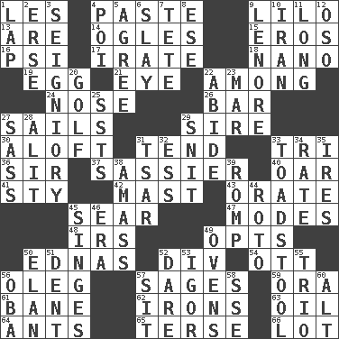 ACROSS 1. French article 4. Thick mixture 9. _ and Stitch 13. "We ___ not amused" (Victoria) 14. Stares at amorously 15. Greek god of love 16. 23rd letter of the Greek alphabet 17. Feeling or showing extreme anger 18. Billionth: prefix 19. Oval reproductive body of a fowl 21. Sight organ 22. Amid 24. Characteristic smell of wine 26. Tavern 27. Travels by water 29. Male parent of an animal 30. High up in or into the air 31. Be inclined (to) 33. Three (prefix) 36. Title for a knight 37. More disrespectful 40. Boat paddle 41. Filthy place 42. Vertical spar for supporting sails 43. Speak pompously 45. Wither 47. Methods 48. Big collection agency 49. Chooses 50. Ferber et al. 52. HTML Container Element 54. Baseball player Mel 56. Cassini of fashion 57. Gurus 59. Mouth or opening 61. Object of repulsion 62. Metal shackles 63. Petroleum 64. Pismires 65. Laconic 66. Car dealer's back yard DOWN 1. Pet locale 2. Celtic language 3. Signiory (variant) 4. Luau course 5. Match 6. Kill 7. Wig 8. Compass dir. 9. Poe poem 10. SW Asia republic 11. Protracted 12. Bear (Spanish) 20. Eighteen holes 22. Stay 23. Third mo. 25. Fast planes 27. Backtalk 28. Set down 29. In a ____ (agitated or irritated) 31. Russian ruler of old 32. Curvy letter 33. Inedible or poisonous agaric 34. Pace 35. Angers 38. Collect or gather 39. Frolic 44. Printing process, for short 45. Burns superficially 46. Epoch 49. Baking chambers 50. Flair 51. Undesirable depression on a surface 52. Have the gumption 53. Russian composer Stravinsky 55. Musical group of three 56. Chief or king in Benin or Nigeria 57. Be seated 58. Compass dir. 60. Keyboard modifier key
