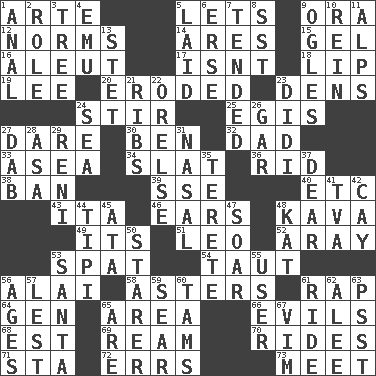 ACROSS 1. Johnson of "Laugh-In" 5. Allows 9. Mouth or opening 12. Typical models 14. Ancient Greek god of war 15. Set 16. Eskimo relative 17. Is not 18. Mouth edge 19. Area sheltered from the wind 20. Worn away 23. Cub Scout units 24. Commotion 25. The front part of a cuirass 27. Have the gumption 30. Benjamin's nick name 32. Male parent 33. At sea 34. Narrow board 36. To free from 38. Forbid 39. Compass dir. 40. And so on (abbr.) 43. Call ___ day 46. Hearing organs 48. Polynesian shrub of the pepper family 49. ___ a Wonderful Life 51. Lion 52. Like ___ of sunshine 53. Petty quarrel 54. Tense 56. Jai ____ 58. Michaelmas daisies 61. Strike 64. Commissioned mil. rank 65. Length times width 66. Vices 68. Eastern Standard Time (abbr.) 69. 480, 500 or 516 sheets of paper 70. Amusement-park features 71. R.R. building 72. Blunders 73. Rendezvous DOWN 1. Of or related to the anus 2. Hero or heavy, e.g. 3. Relationship diagram 4. Australian flightless bird 5. Put down 6. Celtic language 7. Looked after 8. Fast jet (abbr.) 9. Stares at amorously 10. It's straight from the horse's mouth 11. High mountains 13. Proofreading order 21. Teases 22. Threatening words 23. "You Light Up My Life" star Conn 24. Ocean 26. Slender fish 27. Pat or tap gently 28. White ___ sheet 29. Painter Guido (1575-1642) 31. Rhinal 35. Cigar-shaped 37. Letter starter 41. Federal power corp. 42. Island 44. Native american tent (variation) 45. _ moment's notice (2 wds.) 47. Fly high 48. Krazy ___ of comics 50. A viewer who gazes fixedly 53. Before Barbara or Clara 55. One who uses or employs something 56. Eras 57. For fear that 59. Singe 60. Scottish caps 61. Travel on or in a vehicle 62. Toward shelter 63. Inconspicuous attention getter 65. "We ___ not amused" (Victoria) 67. Zeal