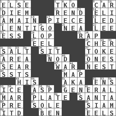 ACROSS 1. Otherwise 5. Ring climax 8. Auto 11. South Vietnam president (1954) 12. Tear apart 14. Connecticut Ivy Leaguer 15. At full speed 17. Part 18. Directed 19. Small, flat, pigmented spot on the skin 21. Teachers' org. 22. Area sheltered from the wind 23. Curvy letter 24. Trim (branches) 25. Strike 27. Snakelike fish 28. "Mermaids" star 31. Table seasoning 35. Be seated 37. Casino tip 38. Length times width 39. Lower and raise head in agreement 41. Singles 42. Shrivel 43. Armed conflict 45. A home for chicks 46. Fast planes 47. Atlas unit 49. Part of HMS, perhaps 51. Alias (abbr.) 52. Followers of ems 55. Frozen water 57. Viper 60. Commissioned military rank 62. Third mo. 63. Food holder 65. Before Barbara or Clara 66. Before (prefix) 67. Flatfish 68. Thailand, formerly 69. It would 70. Benjamin's nick name 71. Snakelike fish DOWN 1. Peak District village in England 2. Citrus fruits 3. Seines 4. Give off 5. Three (prefix) 6. Peachy ____! 7. At one time in the past 8. Portable communications device 9. Toward shelter 10. Travel on or in a vehicle 13. Letter starter 16. Mediterranean tributary 17. Cotton for raincoats, e.g. 20. Leaves 26. 13-14th century defensive garment 29. Makes supply last 30. State of inaction 31. Backtalk 32. Ancient Greek god of war 33. Tough but pliablecoriaceous 34. Tarsus (plural) 36. Pull behind 40. Break 44. Immoral or dissolute person 48. Baking dishes 50. Plant excrements 52. Bert's buddy 53. Brizilian seaport 54. Shuts with force 55. Body of Kaffir warriors 56. Draw slowly or heavily 58. Messy guy 59. Diluted with white 61. Relaxation 64. "___ Little Indians"