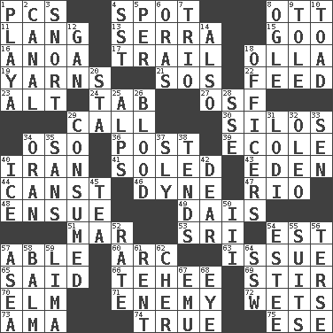 ACROSS 1. Personal Computers (abbr.) 4. Specific locale 8. Baseball player Mel 11. Austrian-born American filmmaker Fritz 13. Spanish missionary in California 15. Thick or sticky substance 16. Small Philippine buffalo 17. Get behind 18. Spanish pot 19. Tall tales 21. Mayday 22. Nourish 23. Keyboard modifier key 24. Keyboard key 27. Order of Saint Francis (abbr.) 29. Give a ring to 30. Grain storage towers 34. Bear (Spanish) 36. Mail 39. Learning spot: Fr. 40. SW Asia republic 41. Having a sole or soles 43. Genesis locale 44. 2nd pers. sing. pres. of can (arch.) 46. Unit of force 47. River (Sp.) 48. Take place subsequently 49. Raised platform 51. Impair 53. _ Lanka 54. Eastern Standard Time (abbr.) 57. Competent 60. Curve 63. Come out of 65. Alleged 66. Giggle 69. Use a swizzle stick 70. Shade tree 71. Foe 72. Moistens 73. Nanny (var.) 74. Loyal 75. Compass dir. DOWN 1. Beach, in Buenos Aires 2. Lessep's creation 3. Derisive sound 4. Fast jet (abbr.) 5. For each 6. Mouths or openings 7. Musical group of three 8. Stare 9. Lacquered or enameled metalware 10. Frog relative 12. Separate the seeds from cotton 14. In addition 18. Persons of authority 20. R.R. building 25. High mountains 26. Vital fluid 28. Compass dir. 29. Ingested 31. Farming town in central California 32. Margarine 33. Elected rep. 34. Northwest Algerian city 35. Without 37. Stealthy 38. Watches over 40. Frozen water 42. Letter starter 45. Beverage made from leaves 50. One more than two 52. Pace 54. First name in cosmetics 55. Sets of matching outer garments 56. Laconic 57. At sea 58. Lip ointment 59. Pale green bean 61. Monthly bill 62. "Mermaids" star 64. Compass dir. 67. Australian flightless bird 68. Sight organ
