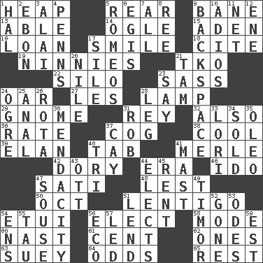 ACROSS 1. Pile 5. Hitchcock's "____ Window" 9. Object of repulsion 13. Competent 14. Stare at amorously 15. An important port of Yemen 16. Grant temporary use of 17. Grin 18. Quote 19. Fools 21. Ring climax 22. Grain storage tower 23. Backtalk 24. Rowing implement 27. French article 28. Desk light 29. Dwarf 31. Marina Del _, California 32. In addition 36. Pace 37. Gear tooth 38. Calm and collected 39. Flair 40. Keyboard key 41. Haggard of country music 42. Small, narrow, flatbottom fishing boat 44. Epoch 46. Wedding promise 47. Suttee (variant) 48. For fear that 50. Sep. follower 51. Small, flat, pigmented spot on the skin 54. Needle holder 56. Voters do this 58. Method 60. Political cartoonist Thomas 61. Penny 62. Washington bills 63. Chop _ 64. Probability 65. Remainder DOWN 1. Actor Linden 2. Inky black, to poets 3. Mountain range southwest of Kyrgyzstan 4. Actor Sean's family 5. Lover boys 6. The front part of a cuirass 7. Everything 8. To riddle 9. Keyboard key 10. Goodbye (Sp.) 11. Remaining after all deductions 12. Compass dir. 17. Drop; flow; fall 20. "Death on the ____" 21. Scottish cap 23. Declare 24. Legendary monster 25. Of or related to the anus 26. Round or rotation of duties 28. Part of a journey 30. Ananias' fault 31. Director Reiner 33. Australian parrot (variant) 34. Exchanged or delivered for money 35. Butter sub 37. Island 40. Three (prefix) 41. Vertical spar for supporting sails 43. Baseball player Mel 44. Chooses 45. Monthly bill 47. Boozer 49. Southeast Indonesia island 51. Grant temporary use of 52. Went 53. Lyric poems 54. Followers of ems 55. The 19th letter of the Greek alphabet 56. Environmental prefix 57. Directed 59. Eastern Standard Time (abbr.)
