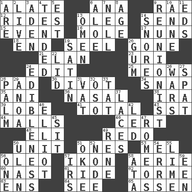 ACROSS 1. Having winglike extensions 6. Santa ___, CA 9. Actress Charlotte 12. Amusement-park features 13. Cassini of fashion 14. Transmit 15. Happening 16. Undercover agent 17. Religious women 18. Conclude 19. Stitch closed the eyes of (a falcon) 20. Went 21. Style 23. RI univ. 24. Prepare for publication 25. Catcalls? 28. Writing tablet 30. A piece of turf (Scot.) 34. Fastener 35. Cuckoo 36. Relating to the nose 38. Retirement account (abbr.) 39. Ear part 41. Add up to 43. Fast jet (abbr.) 44. Shopping centers 46. Sure thing 48. Connecticut Ivy Leaguer 49. Make new 50. A single undivided whole 51. Singles 53. Cartoonist voice _ Blanc 56. Margarine 57. Image 58. Nest on high 60. Political cartoonist Thomas 61. Travel on or in a vehicle 62. Singer Mel 63. Followers of ems 64. Observe 65. NE Netherlands city DOWN 1. "We ___ not amused" (Victoria) 2. Not recorded 3. An important port of Yemen 4. Watched over 5. Eastern Standard Time (abbr.) 6. _ vera 7. 1994 drama film starring Jodie Foster 8. Ripen 9. One who advocates reunion 10. Queen of England 1702-14 11. Begley and Asner 13. Sign of things to come 14. Sounds asleep 19. Smooth fabric 20. Chewing product 22. Flaplike covering 24. The property of being fit to eat 26. Armed conflicts 27. Argument over a trivial matter 28. Inside of hand 29. Small Philippine buffalo 31. Large container 32. Bear (Spanish) 33. Make lace 37. Shoestrings 40. American author Paul (1891-1958) 42. Directed 45. Be seated 47. Lover boys 49. French philosopher Descartes 50. ____ Bator 51. Migrant worker of the '30s 52. Thickened enlargement 54. Blunders 55. Citrus frut 56. Single 57. Big collection agency 58. "One Day ___ Time" 59. Car or cant ending