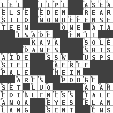 ACROSS 1. Flowery wreath 4. Native american tent (variation) 8. At sea 12. Otherwise 14. Genesis locale 15. Bring up, as a child 16. Grain storage tower 17. Unrelated to defense, as in spending 20. Adolescent 21. Single 22. "One Day ___ Time" 23. Sadhe (variant) 27. Give off 29. Polynesian shrub of the pepper family 31. Flatfish 34. Natives or inhabitants of Denmark 35. Indian titles of respect 36. Assistant 39. Compass dir. 41. United States Postal Service (abbr.) 42. Proofreading order 43. Nest on high 46. Light colored 47. Chow _ 48. Ancient Greek god of war 51. Puddle 54. Arrange properly for use 56. Nilotic language 58. First of billions? 61. The property of being fit to eat 66. Story 67. Small Philippine buffalo 68. Sight organs 69. Liveliness 70. Austrian-born American filmmaker Fritz 71. Transmitted 72. Followers of ems DOWN 1. For fear that 2. Writer Wiesel 3. Small island 4. Nine, plus one 5. Wedding promise 6. Animal enclosure 7. _ china 8. "We ___ not amused" (Victoria) 9. Elected representatives 10. 90 degrees 11. Length times width 13. Immeasurably long periods of time 18. Compass dir. 19. Opposite of masc. 24. Alias (abbr.) 25. Daniel's nick name 26. Nights before holidays 28. Come out of 30. Indian state 32. Mouth edge 33. Curvy letter 34. Prevent from occurring 36. Cleo's killer 37. Call ___ day 38. Accusation by an informer 40. Shed a tear 44. _ de Janeiro 45. Indiana (abbr.) 49. Pipe bend 50. Institute legal proceedings 52. Yard entry 53. Peak District village in England 54. Lick closed 55. Pulitzer Prize-winning author Ferber 57. Singles 59. Actor Alda or Thicke 60. Not women's 62. Container for groceries 63. Sight organ 64. Elected rep. 65. Fast jet (abbr.)