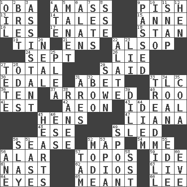 ACROSS 1. Chief or king in Benin or Nigeria 4. Collect or gather 9. Expression of disdain 13. Big collection agency 14. Lies 15. Singer Murray 16. French article 17. Related on the mother's side 18. Comedian Laurel of Laurel & Hardy 19. Metal container 21. Followers of ems 22. Columnist Joseph or Stewart 24. Back-to-school mo. 26. Untruth 27. "_____ Recall" 29. Expressed in words 30. Peak District village in England 31. Collude with 33. Affectionate concern, for short 36. "___ Little Indians" 37. Moved like an arrow 40. Friend of Pooh 41. Eastern Standard Time (abbr.) 42. A really long time 43. Perfect 45. Coop moms 47. Woody, climbing, usually tropical plant 48. Compass dir. 49. Downhill vehicle 50. Gospel singer Marvin 52. Atlas unit 54. Madame (abbr.) 56. Having or resembling wings 57. Literary convention 59. Binary compound 61. Political cartoonist Thomas 62. Goodbye (Sp.) 63. 54 in ancient Rome 64. Snake ____ (dice throw) 65. Intended 66. Area sheltered from the wind DOWN 1. Petroleum 2. Cy Young winner Saberhagen 3. Aide 4. Had dinner 5. French painter Edouard 6. Actor Alda or Thicke 7. Puts into a specified state 8. Compass dir. 9. Went by 10. To the inside or interior of 11. Fastener 12. Layer 20. Anneal 22. Having winglike extensions 23. Cards in a Roman deck? 25. Entreaty 27. False hair 28. Lyric poems 29. Stitched 31. Ancient Greek god of war 32. Surprise greeting 33. Excercise machine 34. Grant temporary use of 35. Root beer relative 38. The wife of a rajah (variant) 39. Deli pickle 44. South Vietnam president (1954) 45. Centers 46. Curvy letter 49. Soup utensil 50. Kill 51. Comfort 52. Method 53. Capital of Western Samoa 55. Singer Brickell 56. A saturated hydrocarbon 57. Scottish cap 58. Fast jet (abbr.) 60. First lady