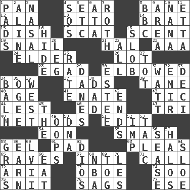 ACROSS 1. Baking dish 4. Burn superficially 8. Object of repulsion 12. Insect wing 13. "Beetle Bailey" pooch 14. Naughty child 15. Food container 17. Scram! 18. Odor 19. Slow-paced one 21. Actor Linden 23. American Automobile Association (abbr.) 24. A person who is older than you are 26. Car dealer's back yard 28. Mild oath 30. Turned at an angle; bent 34. Ribbon knot 37. Bits 39. Docile 40. Grow older 41. Maternal 43. Nervous spasm 44. For fear that 46. Locale of original sin 47. Three (prefix) 48. Modes 51. Prepare for publication 54. Period of immesurable duration 55. Box-office sellout 58. Set 61. Groovy apt. 63. Entreaties 65. All-night dance parties 67. International (abbr.) 71. Give a ring to 72. Roberta Peters solo 73. Mitch Miller's instrument 74. "Barney Miller" actor Jack 75. In a ____ (agitated or irritated) 76. Droops 77. Compass dir. DOWN 1. Writing tablets 2. Place in a line 3. Relating to the nose 4. Distress signal 5. And so on (abbr.) 6. _ moment's notice (2 wds.) 7. Writer of Portnoy's Complaint (1969) 8. English channel? 9. Type of rug 10. Grandmother 11. Singer James 16. Flintstone garb 18. Messy guy 20. Part of a journey 22. 100% 25. Assign a rank or rating to 27. Small child 29. Natives or inhabitants of Denmark 30. First name in cosmetics 31. Electrical Unit 32. Arab leader 33. Tenth: prefix 34. Lip ointment 35. Double curve, resembling the letter S 36. Compass direction 38. June honoree 42. Conclusions 45. Definite Article 49. I made a mistake 50. Heredity factor (abbr.) 52. Naughty child 53. Baby powder 56. Gospel singer Marvin 57. Rings 58. Pate de foie ____ 59. Merit 60. 57 in ancient Rome 62. "Vaya con ____" 64. _ gin 66. Erode 68. Basketball assoc. 69. Coat; cloak 70. French article