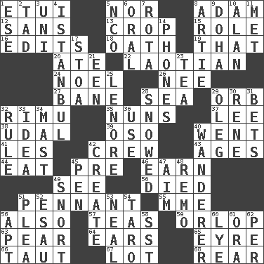 ACROSS 1. Needle holder 5. Not either 8. First of billions? 12. Without 13. Riding implement 15. Hero or heavy, e.g. 16. Prepares for publication 18. Pledge 19. Not this but _ 20. Had dinner 22. Of or relating to Laos or its people 24. Christmas carol 26. Born 27. Object of repulsion 28. Ocean 29. Globe 32. Tall New Zealand timber tree 35. Religious women 37. Area sheltered from the wind 38. Hereditary estate 39. Bear (Spanish) 40. Gone 41. French article 42. Ship's personnel 43. Eons 44. Erode 45. Before (prefix) 46. Merit 49. Observe 50. Passed on 51. Pre-World Series prize 55. Madame (abbr.) 56. In addition 57. Beverages made from leaves 59. Fourth or lowest deck 63. Lightbulb-shaped fruit 64. Hearing organs 65. Jane of fiction 66. Drawn tight 67. Car dealer's back yard 68. Tail end DOWN 1. Compass dir. 2. Small amount or degree 3. Single; one (prefix) 4. Byzantium, centuries later 5. Non-commissioned officer (abbr.) 6. Relating to the mouth 7. Round or rotation of duties 8. Nick name for Arthur 9. Capital of the state of Qatar 10. Actor Alda or Thicke 11. Was introduced to 14. Gives a jingle 17. Portico 21. Car or cant ending 23. Beverage made from leaves 25. Poe poem 28. Frozen precipiation fell 29. Cassini of fashion 30. French philosopher Descartes 31. Stakes 32. Governing power 33. The content of cognition 34. Vertical spar for supporting sails 36. Purpose 40. Nomad 42. Cause to be 45. Writing instrument 47. Direct toward a target or goal 48. San ____ (Riviera town) 49. Derisive sound 51. Entreaty 52. He sold his birthright 53. Be tempered by heat 54. Pacific island yam 56. Fitting 58. Fast jet (abbr.) 60. Potassium hydroxide 61. Mouth or opening 62. For each