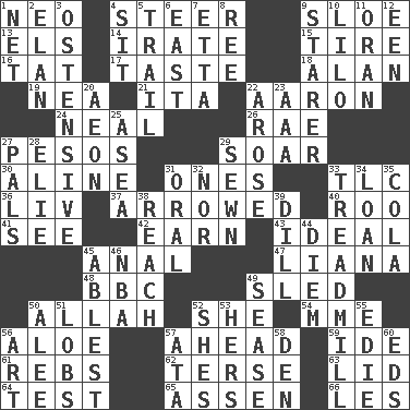 ACROSS 1. Modern: prefix 4. Navigate 9. _ gin 13. Raised railways 14. Feeling or showing extreme anger 15. Become fatigued 16. Make lace 17. Clothes sense 18. Actor Alda or Thicke 19. Teachers' org. 21. Call ___ day 22. Composer Copland 24. Actress Patricia 26. Actress Charlotte 27. Mexican monetary units 29. Fly high 30. Place in a line 31. Singles 33. Affectionate concern, for short 36. 54 in ancient Rome 37. Moved like an arrow 40. Friend of Pooh 41. Perceive with the eye 42. Merit 43. Standard of perfection 45. Of or related to the anus 47. Climbing, woody, usually tropical vines 48. English channel? 49. Downhill vehicle 50. Assad's deity 52. A female animal or person 54. Madame (abbr.) 56. _ vera 57. Toward the future 59. Binary compound 61. Confederate soldiers (slang) 62. Laconic 63. Flaplike covering 64. Trial 65. NE Netherlands city 66. French article DOWN 1. Remaining after all deductions 2. Style 3. Clearly or manifestly demonstrative 4. Be seated 5. Lag or linger behind 6. Compass direction 7. Singer James 8. To separate or throw off 9. A viewer who gazes fixedly 10. _ and Stitch 11. NW Algerian seaport 12. Car or cant ending 20. Period of immesurable duration 22. Came up 23. Auto club (abbr.) 25. Toward the sea 27. Friends 28. Writer Wiesel 29. Stitched 31. Of the mouth 32. And not 33. Excercise machine 34. Grant temporary use of 35. Root beer relative 38. Arrive at 39. Deli pickle 44. South Vietnam president (1954) 45. Most capable 46. Basketball assoc. 49. Gospel singer Marvin 50. Toward shelter 51. Tennis shots 52. "______ My Girl" (Turtles hit) 53. Possessive pronoun 55. Singer Brickell 56. Nonscientific branch of learning 57. _ moment's notice (2 wds.) 58. Lair 60. Begley and Asner