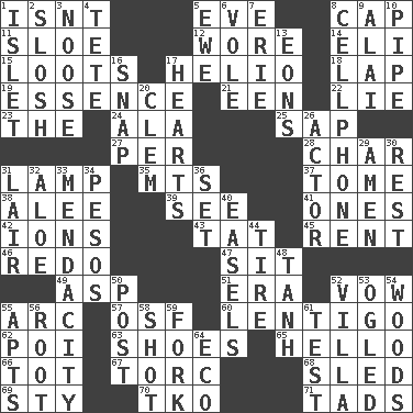 ACROSS 1. Is not 5. First lady 8. Head covering 11. _ gin 12. Had on 14. Biblical high priest 15. Plunders 17. Sun: prefix 18. Infant locale 19. Center 21. Car or cant ending 22. Untruth 23. Definite Article 24. Wing 25. Plant excrement 27. For each 28. Burn to charcoal 31. Desk light 35. Mountains (abbr.) 37. Heavy book 38. Toward shelter 39. Perceive with the eye 41. Singles 42. Charged atoms 43. Make lace 45. Monthly bill 46. Make new 47. Be seated 49. Viper 51. Epoch 52. Promise 55. Curve 57. Order of Saint Francis (abbr.) 60. Small, flat, pigmented spot on the skin 62. Luau course 63. Imelda's hoard 65. Phone greeting 66. Small child 67. Torque (variant) 68. Downhill vehicle 69. Filthy place 70. Ring climax 71. Small amounts or degrees DOWN 1. Small island 2. Agitate, as a liquid 3. Trap for birds or small mammals 4. False hair 5. She-sheep 6. Grand slam 7. One of the Great Lakes 8. Portable communications device 9. Jai ____ 10. Corncob 13. Immeasurably long periods of time 16. Fastener 17. Centers 20. Clement's nick name 26. Thespian 29. So be it 30. Repose 31. Den 32. Medicinal plant 33. Ananias' fault 34. Mexican monetary units 36. Put into a specified state 40. Artist's stands 44. Become fatigued 48. Hyperbolic tangent 50. Mail 52. Country residence 53. Stared at amorously 54. Forest 55. Flats, for short 56. Carrot, for example 58. Guess 59. Tined utensil 61. Trial 64. Environmental prefix