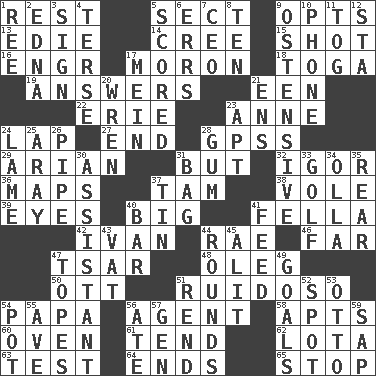 ACROSS 1. Repose 5. Religious group 9. Elects 13. Singer Brickell 14. Algonquian 15. Attempt 16. Engineer (abbr.) 17. Person of subnormal intelligence 18. Ancient Roman robe 19. Statements in reply to questions 21. Car or cant ending 22. 4th largest of the Great Lakes 23. Singer Murray 24. Pet locale 27. Conclusion 28. Global Positioning Systems (abbr.) 29. Believer in; advocate of (suffix) 31. On the contrary 32. Russian composer Stravinsky 36. Atlas contents 37. Scottish cap 38. Grand slam 39. Snake ____ (dice throw) 40. Of large size 41. Chap (slang) 42. "Terrible" tsar 44. Actress Charlotte 46. At a great distance 47. Russian ruler of old 48. Cassini of fashion 50. Baseball player Mel 51. Boisterous (Brazilian Portuguese) 54. Dad 56. Rep 58. Flats, for short 60. Baking chamber 61. Look after 62. Globular water bottle used in Asia 63. Trial 64. Conclusions 65. Constrict DOWN 1. To riddle 2. Pulitzer Prize-winning author Ferber 3. Signal 4. Laconic 5. Tallied 6. Blunders 7. Corporate head (abbr.) 8. "___ Little Indians" 9. Clearly or manifestly demonstrative 10. Give a jingle 11. Coat; cloak 12. R.R. building 17. Chow _ 20. Songbird 21. Followers of ems 23. Fitting 24. Unable to walk 25. Like ___ of sunshine 26. Corncob 28. Chewing product 30. Helper 31. Container for groceries 33. _ course 34. Rounded earthenware pot or jar 35. Stern 37. Metal container 40. Oblong piece of solid material 41. Nourish 43. Large container 44. Periods in a boxing match 45. Came down and settled, as after flight 47. Drinks excessively 49. Finish lines 51. Tear apart 52. Specific locale 53. Von Bismarck 54. Plant holder 55. "___ Maria" 56. Had dinner 57. Commissioned mil. rank 59. Plant excrement
