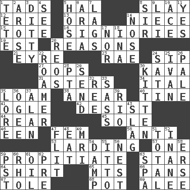 ACROSS 1. Small amounts or degrees 5. Actor Linden 8. Kill 12. One of the Great Lakes 13. Mouth or opening 14. Sibling's daughter 15. Carry 16. Seigniories (variant) 19. Eastern Standard Time (abbr.) 20. Thinks logically 21. Jane of fiction 23. Actress Charlotte 24. Small drink 27. I made a mistake 30. Polynesian shrub of the pepper family 31. Michaelmas daisies 34. Slanted text style (abbr.) 35. Rich soil 38. Approach 40. Prong on a fork 41. Stare at amorously 42. Stop 44. Stern 45. Flatfish 46. Car or cant ending 47. Opposite of masc. 50. Against 53. Preparing or cooking with lard 57. Single 59. Appease 63. Play the lead 64. Upper-body garment 65. Mountains (abbr.) 66. Baking dishes 67. Lacquered or enameled metalware 68. Plant holder 69. Toward shelter DOWN 1. False hair 2. Came up 3. Short, simple song 4. Perceive with the eye 5. Flexible conduit 6. Roberta Peters solo 7. Fails to keep up a pace 8. Title for a knight 9. Luau accessory 10. Adept person 11. Affirmative reply 14. Olfactory organ 17. Not either 18. _ tizzy (2 wds.) 20. Vintage cars 22. Nomad 24. Suttee (variant) 25. "Terrible" tsar 26. Light colored 28. Parent Teacher Association (abbr.) 29. Transmit 30. Baby cat 32. To separate or throw off 33. Backtalk 35. Old wives' tales, e.g. 36. Double curve, resembling the letter S 37. Actor Alda or Thicke 39. River (Sp.) 43. Volcanic refuse 47. Sudden quick movement 48. Ingest 49. Medical imaging device (abbr.) 51. Add up to 52. Empty; void 54. Moist 55. "Tell ____ the Marines!" 56. A home for chicks 58. Celtic language 59. Pacific Standard Time (abbr.) 60. 17th letter of the Greek alphabet 61. Lubricate 62. Before (prefix) 63. Health resort