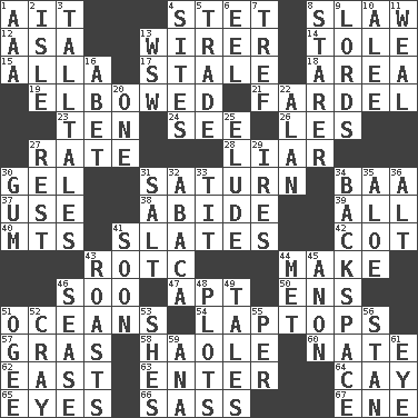 ACROSS 1. Small island 4. Proofreading order 8. Cole _ (cabbage dish) 12. White ___ sheet 13. One who wires 14. Lacquered or enameled metalware 15. Silent film actress Nazimova 17. Showing deterioration from age 18. Type of rug 19. Turned at an angle; bent 21. Pack 23. Nine, plus one 24. Perceive with the eye 26. French article 27. Assign a rank or rating to 28. One who doesn't tell the truth 30. Set 31. Titan orbits this 34. Sound made by sheep 37. Purpose 38. Tolerate 39. 100% 40. Mountains (abbr.) 41. Chalkboards 42. Small bed 43. College mil. group 44. Create 46. "Barney Miller" actor Jack 47. Fitting 50. Followers of ems 51. Seas 54. Portable computers 57. Pate de foie ____ 58. White Person, in Hawaii 60. Nathan's nickname 62. 90 degrees 63. Keyboard key 64. Island 65. Sight organs 66. Backtalk 67. Compass dir. DOWN 1. American Automobile Association (abbr.) 2. Capri or Wight 3. Baron Munchausen's specialties 4. Locates 5. Exchange 6. Snakelike fish 7. Unclean, religiously 8. A viewer who gazes fixedly 9. Nobles 10. Toward shelter 11. Welt 13. Compass dir. 16. Collude with 20. Single 22. Actor Alda or Thicke 25. Dodge 27. Remainder 29. Angers 30. Chewing product 31. Table seasoning 32. Phillipine bananalike plant 33. Teat (slang) 34. Keyboard key 35. Medicinal plant 36. Keyboard modifier key 41. Within a short period 43. Exposes to great heat 44. Was introduced to 45. At once, immediately (arch.) 46. Gospel singer Marvin 48. Schemes 49. Falsehoods 51. Double curve, resembling the letter S 52. Supercomputer manufacturer 53. "______ My Girl" (Turtles hit) 55. For each 56. Comedian Laurel of Laurel & Hardy 59. Santa ___, CA 61. Sight organ