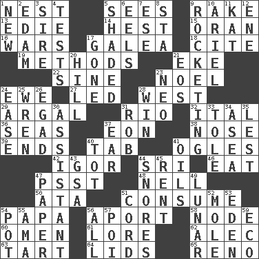 ACROSS 1. Egg locale 5. Perceives with the eye 9. Libertine 13. Singer Brickell 14. Behest 15. Northwest Algerian city 16. Armed conflicts 17. An organ shaped like a helmet 18. Quote 19. Modes 21. Supplement with great effort 22. Trig term 23. Christmas carol 24. She-sheep 27. Directed 28. Compass direction 29. Therefore, facetiously 31. _ de Janeiro 32. Slanted text style (abbr.) 36. Oceans 37. Period of immesurable duration 38. Olfactory organ 39. Extremities 40. Bar bill 41. Stares 42. Russian composer Stravinsky 44. _ Lanka 46. Ingest 47. Inconspicuous attention getter 48. 1994 drama film starring Jodie Foster 50. "One Day ___ Time" 51. Eat 54. Dad 56. To the left, to Queeg 58. Connecting point 60. Sign of things to come 61. Old wives' tales, e.g. 62. Actor Baldwin 63. Small pie 64. Hats (slang) 65. Western Nevada city DOWN 1. ___ Haven, CT 2. Dutch treat 3. Father 4. Trials 5. Cast a shadow over 6. Snakelike fish 7. Compass dir. 8. R.R. building 9. Shooting up abruptly 10. Satellite of Uranus 11. Krazy ___ of comics 12. Compass dir. 17. Went 20. Land elevation 21. Greek goddess of the dawn 23. Modern: prefix 24. Relaxation 25. Songbird 26. Mild oath 28. Victory 30. Aide 31. Director Reiner 33. Lacquered or enameled metalware 34. Toward the sea 35. For fear that 37. Hearing organ 40. Small child 41. Petroleums 43. Girls' org. (abbr.) 44. Sounds asleep 45. Monthly bill 47. Some stationery 49. Type of eclipse 51. Drawstring 52. Undercover agent 53. Locale of original sin 54. Cooking vessel 55. Housemaid (var.) 56. Everything 57. Luau course 59. Environmental prefix