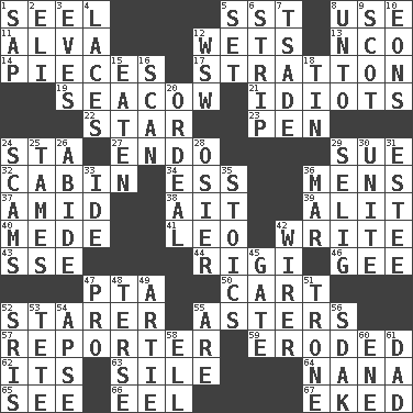 ACROSS 1. Sew up the eyelids of hawks and falcons 5. Fast jet (abbr.) 8. Purpose 11. Inventor's middle name 12. Moistens 13. Non-commissioned officer (abbr.) 14. Parts 17. Ski resort town in Vermont 19. Manatee 21. Foolish or stupid persons 22. Play the lead 23. Fenced enclosure 24. R.R. building 27. Inside; within (prefix) 29. Institute legal proceedings 32. Apartment or room in a ship 34. Curvy letter 36. Not women's 37. Among 38. Small island 39. Set down 40. Ancient Persian 41. Lion 42. Compose 43. Compass dir. 44. Swiss mountan, "Queen of the Mountains" 46. Unit of force equal to gravity 47. Parent Teacher Association (abbr.) 50. Haul 52. A viewer who gazes fixedly 55. Michaelmas daisies 57. News announcer 59. Eaten away 62. It is 63. Filth; sediment 64. Grandmother 65. Perceive with the eye 66. Snakelike fish 67. Supplemented with great effort DOWN 1. Plant excrement 2. Connecticut Ivy Leaguer 3. Nights before holidays 4. Shoestrings 5. Arrange properly for use 6. Long narrow piece of something 7. Sadhe (variant) 8. To (old English) 9. Native of Scotland 10. Immeasurably long periods of time 12. Compass dir. 15. Ingested 16. Examine hastily 18. Shallow baking pan 20. Severe or trying experience 24. Fraudulent business schemes 25. Softens 26. Remain 28. Flexible twig of a willow tree 29. Major League Baseball Commissioner Bud 30. Join together 31. First name in cosmetics 33. Binary compound 35. Unemotional ones 36. Make imperfect 42. One who wires 45. Yard entry 47. Adept person 48. Laconic 49. Nick name for Arthur 51. Marketplace scale 52. Indian titles of respect 53. False hair 54. Domed church section 55. "We ___ not amused" (Victoria) 56. Neighbor of Neb. 58. Pipe bend 60. Compass dir. 61. June honoree