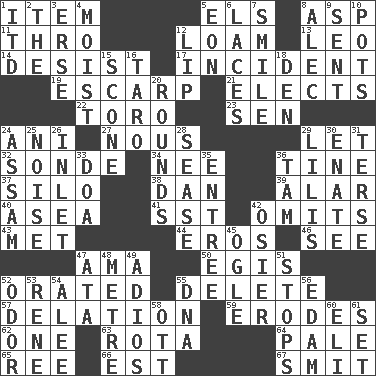ACROSS 1. A whole individual unit 5. Raised railways 8. Viper 11. Through, poetically 12. Rich soil 13. Lion 14. Cease 17. Event 19. Fortification 21. Opts 22. "Corrida" creature 23. Elected rep. 24. Cuckoo 27. Common sense 29. Allow 32. Message 34. Born 36. Prong on a fork 37. Grain storage tower 38. Daniel's nick name 39. Having or resembling wings 40. At sea 41. Fast jet (abbr.) 42. Leaves out 43. Was introduced to 44. Greek god of love 46. Observe 47. Housemaid (var.) 50. Armor plate that protects the chest 52. Spoke pompously 55. Erase 57. Conveyance 59. Eats (away) 62. Single 63. Roll call or roster of names 64. Light colored 65. Portuguese money of account (variant) 66. Eastern Standard Time (abbr.) 67. Stricken, poetically DOWN 1. It would 2. Definite Article 3. Celtic language 4. Wet 5. Period of immesurable duration 6. Shoestrings 7. Grin 8. Actor Baldwin 9. Posted 10. Plant holders 12. Mouth edge 15. Biscuitlike quick bread 16. Pacific island yam 18. Lair 20. Periods in a boxing match 24. Indian state 25. Annoying sound 26. An arm off of a larger body of water 28. Gospel singer Marvin 29. Ms. Damita and namesakes 30. Related on the mother's side 31. Laconic 33. ___ good deed 35. Main course 36. Scottish cap 42. Flexible twig of a willow tree 45. Stare 47. "One Day ___ Time" 48. Distance measurement (Brit.) 49. Goodbye (Sp.) 51. Discontinues 52. Aroma 53. French philosopher Descartes 54. Toward shelter 55. Heredity factor (abbr.) 56. Dutch treat 58. Baseball player Mel 60. Biblical high priest 61. Arrange properly for use