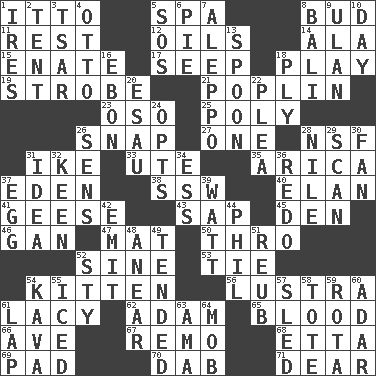 ACROSS 1. "Tell ____ the Marines!" 5. Health resort 8. Partially opened flower 11. Relief 12. Petroleums 14. In the manner of 15. Maternal 17. Ooze 18. Shaw product 19. Disco prop 21. Cotton for raincoats, e.g. 23. Bear (Spanish) 25. Many (prefix) 26. Fastener 27. Single 28. Science/research agcy. 31. Mamie's husband 33. Shoshoni 35. N. Chile seaport 37. Genesis locale 38. Compass dir. 40. Enthusiasm 41. Honkers 43. Plant excrement 45. Lair 46. Separate the seeds from cotton 47. Floor covering 50. Through, poetically 52. Trig term 53. Neckwear 54. Baby cat 56. A period of five years 61. Made of lace 62. First man 65. Vital fluid 66. "___ Maria" 67. San ____ (Riviera town) 68. Singer James 69. Writing tablet 70. Apply (a substance) by light strokes 71. Letter starter DOWN 1. Angers 2. Portable shelter 3. Russian ruler of old 4. Von Bismarck 5. Mayday 6. Sliced dessert 7. City in Syria 8. Indonesian resort city 9. ____ Bator 10. 24 hours 13. Soup utensil 16. Inky black, to poets 18. Apply oneself diligently 20. He sold his birthright 22. Entreaty 24. Chooses 26. Elected reps. 28. The longest river in the world 29. Examine hastily 30. Air blower 31. The main thing one is thinking about 32. Peachy ____! 34. Curvy letter 36. Do over again 37. Ovum 39. Electrical Unit 42. Send forth 44. Silvers or Donahue 48. Approach 49. Watched over 51. Reuben's nickname 52. Filthy place 54. Polynesian shrub of the pepper family 55. On the rocks 57. Downhill vehicle 58. Lug 59. Roll call or roster of names 60. The sixth month of the Jewish calendar 61. Pet locale 63. Wet nurse (var.) 64. Crowd into