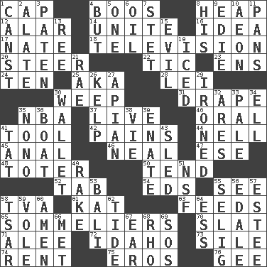 ACROSS 1. Head covering 4. Expressions of contempt or scorn 8. Pile 12. Having or resembling wings 14. Join together 16. The main thing one is thinking about 17. Nathan's nickname 18. Household entertainment appliance 20. Navigate 22. Nervous spasm 23. Followers of ems 24. "___ Little Indians" 25. Alias (abbr.) 28. Flowery wreath 30. Shed a tear 31. Window treatment 35. Basketball assoc. 37. Not recorded 40. Taken by mouth 41. Instrument 42. Aches 44. 1994 drama film starring Jodie Foster 45. Of or related to the anus 46. Actress Patricia 47. Compass dir. 48. Carrier 50. Look after 52. Bar bill 54. Begley and Asner 55. Perceive with the eye 58. Federal power corp. 61. Krazy ___ of comics 63. Gives food to 65. Wine waiters 70. Narrow board 71. Toward shelter 72. Potato state 73. Filth; sediment 74. Monthly bill 75. Greek god of love 76. Unit of force equal to gravity DOWN 1. 2nd pers. sing. pres. of can (arch.) 2. Having winglike extensions 3. Eucharist need 4. On the contrary 5. Single 6. Petroleum 7. Proofreading order 8. Part of HMS, perhaps 9. Singer Brickell 10. A really long time 11. Zero-star reviews 13. Portuguese money of account (variant) 15. Morally bad or wrong 19. On the rocks 21. Actress Charlotte 26. Seaweed 27. Bee-related 29. Pressed 30. Place for singles 32. Ancient Greek god of war 33. Diluted with white 34. Pipe bend 35. Words to Nanette 36. Water vessel 38. Compete 39. Maternal 41. Make lace 43. Downhill vehicle 49. Immoral or dissolute person 51. Overdraft (abbr.) 53. Indonesian resort city 55. Former Milwaukee Brewers owner Bud 56. Peak District village in England 57. First name in cosmetics 58. Russian ruler of old 59. Short-tailed, large-bodied rat 60. So be it 62. Periodic rise and fall of the sea level 64. Double-curved letter 66. Was introduced to 67. Hearing organ 68. 17th letter of the Greek alphabet 69. Distress signal