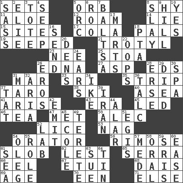 ACROSS 1. Puts into a specified state 5. Globe 8. Like a shrinking violet 11. _ vera 12. Wander 14. Untruth 15. Locates 17. Root beer relative 18. Friends 19. Oozed 21. TNT 23. Born 25. Portico 26. Pulitzer Prize-winning author Ferber 27. Viper 28. Begley and Asner 31. Make imperfect 33. _ Lanka 35. Long narrow piece of something 37. Pacific island yam 38. What Jean-Claude Killy likes to do 40. At sea 41. Get up 43. Period 45. Directed 46. Beverage made from leaves 47. Was introduced to 50. Actor Baldwin 52. Louse (plural) 53. Tired old horse 54. Speaker 56. Full of chinks, cracks, or crevices 61. Messy guy 62. For fear that 65. Spanish missionary in California 66. Snakelike fish 67. Needle case 68. Raised platform 69. Mature 70. Car or cant ending 71. Otherwise DOWN 1. Backtalk 2. Writer Wiesel 3. Carry 4. Ooze 5. The grampus (Milton) 6. Friend of Pooh 7. Greek mezzo-soprano Agnes 8. Kill 9. Land elevation 10. It is so 13. Shops 16. Transmit 18. Parent Teacher Assoc. 20. Lairs 22. I made a mistake 24. Hearing organs 26. Greek god of love 28. Celtic language 29. Passed on 30. Health resort 31. Female horse 32. Operatic vocal solo 34. Eisenhower's nickname 36. Baby powder 37. Make lace 39. SW Asia republic 42. Give off 44. Having or resembling wings 48. Learning spot: Fr. 49. Cylindrical with tapered ends 51. The front part of a cuirass 52. Experiment locale 54. Cassini of fashion 55. Hero or heavy, e.g. 57. Ancient Persian 58. Relating to the mouth 59. Indian titles of respect 60. Relaxation 61. Ocean 63. Institute legal proceedings 64. Shallow baking pan
