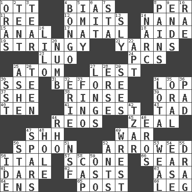 ACROSS 1. Baseball player Mel 4. Prejudice 8. For each 11. To riddle 12. Leaves out 14. Grandmother 15. Of or related to the anus 17. Brizilian seaport 18. Helper 19. Slender, wiry 21. Entertaining tales 23. Nilotic language 24. Personal Computers (abbr.) 25. Smallest unit of an element 27. For fear that 30. Compass dir. 31. Prior to 34. Trim (branches) 37. A female animal or person 38. Wash lightly 39. Mouth or opening 40. "___ Little Indians" 41. Eat 43. Bit 44. Vintage cars 45. Ardor 47. Quiet! 49. Armed conflict 50. Soup utensil 52. Moved like an arrow 56. Slanted text style (abbr.) 57. Biscuitlike quick bread 60. Burn superficially 61. Have the gumption 62. Goes without food and/or water 63. White ___ sheet 64. Followers of ems 65. Mail 66. Part of a journey DOWN 1. Mouths or openings 2. Portable shelter 3. Rend 4. Beat drum 5. "If ____ say so..." 6. Small island 7. R.R. building 8. Aches 9. Extremities 10. Actress Charlotte 13. Playfully artful 14. Drug cop 16. _ and Stitch 20. Unfeeling 22. Fitting 25. American tennis player Robert 26. Adolescent 27. Yearns 28. Celtic language 29. Observes 30. Fast jet (abbr.) 32. 4th largest of the Great Lakes 33. Fine (Spanish) 34. Globular water bottle used in Asia 35. Spoken 36. Writing tablet 42. Russian ruler 44. 17th letter of the Greek alphabet 46. Greek god of love 47. Practice fights 48. Opening into or through something 49. Obtain by seizing forcibly or violently 50. Comedian Laurel of Laurel & Hardy 51. Overdraft (abbr.) 52. Pismires 53. Welt 54. Comfort 55. To be drawn or hauled along 56. Binary compound 58. Head covering 59. Bear (Spanish)