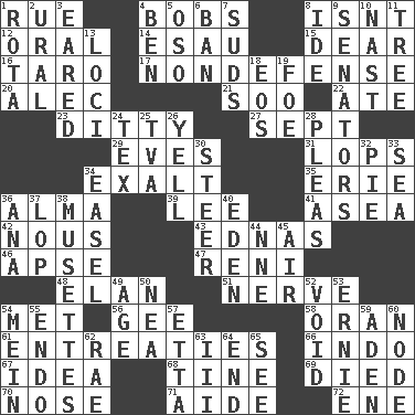 ACROSS 1. Sorrow 4. Moves up and down 8. Is not 12. Relating to the mouth 14. Son of Isaac 15. Letter starter 16. Pacific island yam 17. Unrelated to defense, as in spending 20. Actor Baldwin 21. "Barney Miller" actor Jack 22. Had dinner 23. Simple song 27. Back-to-school mo. 29. Nights before holidays 31. Chops off 34. Glorify 35. One of the Great Lakes 36. _ mater 39. Area sheltered from the wind 41. Toward the sea 42. Common sense 43. Ferber et al. 46. Domed church section 47. Painter Guido (1575-1642) 48. Style 51. Effrontery 54. Was introduced to 56. Unit of force equal to gravity 58. Northwest Algerian city 61. Pleas 66. _ china 67. The content of cognition 68. Prong on a fork 69. Passed on 70. Characteristic smell of wine 71. Assistant 72. Compass dir. DOWN 1. Round or rotation of duties 2. Mountain range 3. Having ears or earlike features 4. Benjamin's nick name 5. Bear (Spanish) 6. Forbid 7. Soap bubbles 8. Binary compound 9. Elected representatives 10. Political cartoonist Thomas 11. Family _ (genealogy) 13. Locales 18. Greek goddess of the dawn 19. Enemy 24. John Ritter's dad 25. Federal power corp. 26. Shout 28. Entreaties 30. Guide 32. Sliced dessert 33. Ocean 34. Artist's stand 36. Santa ___, CA 37. Trim (branches) 38. French bagpipes 40. Locale of original sin 44. Compass dir. 45. Atmosphere 49. Personal question 50. Teachers' org. 52. Empty area or space 53. Bert's buddy 54. Chow _ 55. Inside; within (prefix) 57. Singer James 59. Arabian gulf 60. Connecting point 62. Actress Charlotte 63. One more than two 64. Conclude 65. Observe