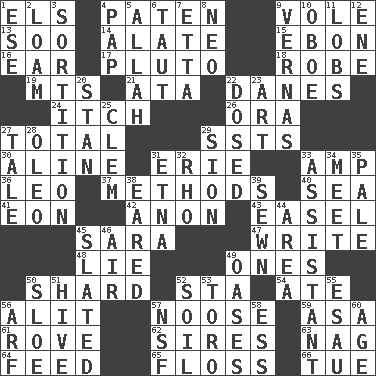 ACROSS 1. Raised railways 4. Eucharist need 9. Grand slam 13. "Barney Miller" actor Jack 14. Having winglike extensions 15. Inky black, to poets 16. Ewer handle 17. Cartoon dog 18. Loose flowing garment 19. Mountains (abbr.) 21. "One Day ___ Time" 22. Natives or inhabitants of Denmark 24. Hankering 26. Mouth or opening 27. "_____ Recall" 29. Fast planes 30. Place in a line 31. 4th largest of the Great Lakes 33. Electrical Unit 36. Lion 37. Modes 40. Ocean 41. A really long time 42. Soon (poet.) 43. Artist's stand 45. "Two Mules for Sister ____" 47. Compose 48. Falsehood 49. Singles 50. Broken piece 52. R.R. building 54. Had dinner 56. Set down 57. Trap for birds or small mammals 59. White ___ sheet 61. Be footloose 62. Fathers 63. Tired old horse 64. Nourish 65. Soft thread for cleaning between teeth 66. Third day of the wk. DOWN 1. Compass dir. 2. Rich soil 3. Casting lots 4. Infant food 5. Assad's deity 6. Tense 7. Singer James 8. Modern: prefix 9. Actresses Bloom and Felton 10. Mitch Miller's instrument 11. Tennis shots 12. Compass dir. 20. Comedian Laurel of Laurel & Hardy 22. Administered medicine 23. Nonscientific branch of learning 25. Clement's nick name 27. Story 28. Butter sub 29. The Jewish people; Israel 31. Inactive volcano in Sicily 32. 17th letter of the Greek alphabet 33. Aide 34. Rendezvous 35. Light colored 38. Having ears or earlike features 39. Stitched 44. Type of rug 45. Scheduled 46. Wind 49. Fertile tracts in a desert 50. _ gin 51. Hub of activity 52. Land 53. "Corrida" creature 55. He sold his birthright 56. Sandy's bark 57. Science/research agcy. 58. Curvy letter 60. Ripen