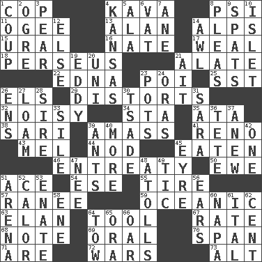 ACROSS 1. Police officer (slang) 4. Polynesian shrub of the pepper family 8. Air pressure measure (abbr.) 11. Double curve, resembling the letter S 13. Actor Alda or Thicke 14. High mountains 15. Mountain range 16. Nathan's nickname 17. Welt 18. Son of Zeus who helped slay Medusa 21. Having winglike extensions 22. Pulitzer Prize-winning author Ferber 23. Luau course 25. Fast jet (abbr.) 26. Raised railways 29. What propaganda does 32. Annoyingly loud 34. R.R. building 35. "One Day ___ Time" 38. Indian skirt 39. Collect or gather 41. Former U.S. Attorney General Janet 43. Cartoonist voice _ Blanc 44. Allow head to fall sleepily 45. Ingested 46. Plea 50. She-sheep 51. Adept person 54. Compass dir. 55. Become fatigued 57. The wife of a rajah (variant) 59. Pertaining to the sea 63. Style 64. Instrument 67. Assign a rank or rating to 68. Observe 69. Taken by mouth 70. Connect, as a bridge 71. "We ___ not amused" (Victoria) 72. Armed conflicts 73. The first octave above the treble staff DOWN 1. Clever action or accomplishment 2. Legendary monster 3. Lightbulb-shaped fruit 4. Sunflower state 5. In the manner of 6. Large container 7. A saturated hydrocarbon 8. Entreaties 9. Arguments over trivial matters 10. Small island 12. Otherwise 14. Leather borer 19. Whirlpool 20. University (slang) 21. Small island 23. Cooking vessels 24. Mouths or openings 26. Followers of ems 27. Rich soil 28. Title for a man of rank and authority 30. Sadhe (variant) 31. "Two Mules for Sister ____" 33. Drop; flow; fall 36. False hair 37. Afresh 39. Pismires 40. Greater amount 42. Single 45. Jane of fiction 47. Born 48. Ringlike coral islands and reefs 49. Nervous spasm 51. Sports stadium 52. Bodily heat indicating an inflammation 53. Related on the mother's side 56. Hearing organs 58. Compass dir. 60. California wine valley 61. Slanted text style (abbr.) 62. Penny 64. Pull behind 65. Mouth or opening 66. Rowing implement