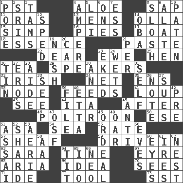 ACROSS 1. Pacific Standard Time (abbr.) 4. _ vera 8. Plant excrement 11. Mouths or openings 13. Not women's 14. Spanish pot 15. Simple or foolish person 16. Sliced desserts 17. Water vessel 18. Gist 21. Thick mixture 22. Letter starter 23. She-sheep 25. Layer 26. Afternoon social gathering 29. Orators 32. From or relating to Ireland 34. Remaining after all deductions 35. Followers of ems 38. Connecting point 39. Gives food to 41. Central Nebraska county 43. Observe 44. Call ___ day 45. Following 46. Characterized by complete cowardliness 50. Compass dir. 51. White ___ sheet 54. Ocean 55. Assign a rank or rating to 57. Bundle of cut stalks of grain 59. Popular '50s hangout 63. "Two Mules for Sister ____" 64. Prong on a fork 67. Jane of fiction 68. Roberta Peters solo 69. The content of cognition 70. Observes 71. Binary compound 72. Instrument 73. Fast jet (abbr.) DOWN 1. Airs 2. Indian titles of respect 3. Scottish caps 4. Electrical Unit 5. Flowery wreath 6. Single 7. Curvy letter 8. Make a splashing sound 9. Having winglike extensions 10. Eucharist need 12. Drove too fast 14. Chief or king in Benin or Nigeria 19. Delicate 20. Head covering 21. For each 23. Supplemented with great effort 24. Soaks 26. Shallow baking pan 27. Greek god of love 28. Helper 30. Approach 31. Automatic 33. Ooze 36. Make mention of 37. Institutes legal proceedings 39. Do some clerical work 40. Singer James 42. Before (prefix) 45. Against 47. Order of Saint Francis (abbr.) 48. Severe or trying experience 49. Boat paddle 51. Slender Brazilian palm 52. Broken piece 53. Nest on high 56. Nights before holidays 58. Auto club (abbr.) 60. Sight organs 61. Angers 62. Egg locale 64. Teat (slang) 65. Wedding promise 66. Modern: prefix