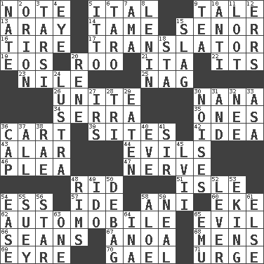 ACROSS 1. Make mention of 5. Slanted text style (abbr.) 9. Falsehood 13. Like ___ of sunshine 14. Docile 15. Sir (Sp.) 16. Become fatigued 17. Interpreter 19. Greek goddess of the dawn 20. Friend of Pooh 21. Call ___ day 22. It is 23. "Death on the ____" 25. Tired old horse 26. Join together 30. Grandmother 34. Spanish missionary in California 35. Washington bills 36. Draw slowly or heavily 39. Locates 42. The main thing one is thinking about 43. Having or resembling wings 44. Vices 46. Entreaty 47. Effrontery 48. To free from 51. Small island 54. Curvy letter 57. Binary compound 58. Cuckoo 60. Supplement with great effort 62. Form of transportation 65. Morally bad or wrong 66. Seines 67. Small Philippine buffalo 68. Not women's 69. Jane of fiction 70. Highlander 71. Goad DOWN 1. Nathan's nickname 2. Constellation of myth 3. Tarsus (plural) 4. Sight organ 5. "Tell ____ the Marines!" 6. Pacific island yam 7. Nursemaid (var.) 8. Soviet premier 1918-24 9. Beverage made from leaves 10. Against 11. Spoils 12. Blunders 15. Volcanic refuse 18. R.R. building 20. French philosopher Descartes 24. A period of five years 27. Big collection agency 28. Three (prefix) 29. Ingested 30. Annoying sounds 31. Added to 32. Born 33. White ___ sheet 36. Head covering 37. Everything 38. Actress Charlotte 40. First lady 41. Title for a knight 45. 57 in ancient Rome 48. Basketball hoops 49. Wedding promise 50. Debunk (Brit. slang) 52. Crowbar 53. Supplementing with great effort 54. Comfort 55. Chop _ 56. Play the lead 58. Medicinal plant 59. Be tempered by heat 61. Otherwise 63. Single 64. _ tizzy (2 wds.) 65. Australian flightless bird