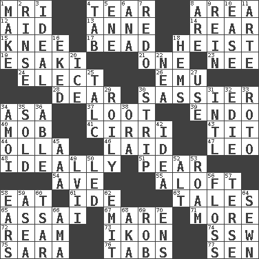 ACROSS 1. Medical imaging device (abbr.) 4. Rend 8. Type of rug 12. Help 13. Queen of England 1702-14 14. Located in or toward the back 15. Leg joint 17. Necklace unit 18. Robbery 19. 1973 Nobel Price Winner (Physics) Leo 21. Single 23. Born 24. Choose 26. Australian flightless bird 28. Letter starter 30. More lively and spirited 34. White ___ sheet 37. Plunder 39. Inside; within (prefix) 40. Crowd into 41. High-altitude cloud 43. Teat (slang) 44. Water jar 46. Put down 47. Lion 48. Under perfect conditions 51. Lightbulb-shaped fruit 54. "___ Maria" 55. Upward 58. Ingest 61. Binary compound 63. Stories 65. Slender Brazilian palm 67. Female horse 71. Greater amount 72. 480, 500 or 516 sheets of paper 73. Image 74. Compass dir. 75. "Two Mules for Sister ____" 76. Bar bills 77. Elected rep. DOWN 1. Create 2. Remove soap 3. Perfect 4. Keyboard key 5. Compass dir. 6. Santa ___, CA 7. Make new 8. "We ___ not amused" (Victoria) 9. It's straight from the horse's mouth 10. Relaxation 11. Johnson of "Laugh-In" 16. Made supply last 18. Cloth borders 20. Frozen water 22. Teachers' org. 25. Baby powder 27. Purpose 29. Agitated, as a liquid 30. Long narrow piece of something 31. International (abbr.) 32. Singer Brickell 33. Printing process, for short 34. Mine, in Marseilles 35. Disposed of to a purchaser 36. Competent 38. Mouth or opening 42. It may be bright or harebrained 45. Auto club (abbr.) 49. 57 in ancient Rome 50. Directed 52. Keyboard modifier key 53. Wander 56. Soft thread for cleaning between teeth 57. Laconic 58. Hearing organs 59. Toward the sea 60. Russian ruler of old 62. Give off 64. Stitched 66. Wet nurse (var.) 68. Alias (abbr.) 69. Director Reiner 70. Followers of ems