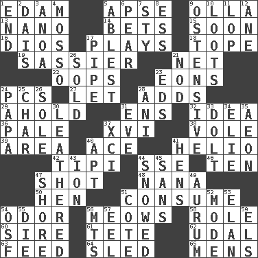 ACROSS 1. Dutch treat 5. Domed church section 9. Rounded earthenware pot or jar 13. Billionth: prefix 14. Wagers 15. Within a short period 16. "Vaya con ____" 17. Live dramatic performances 18. Drink excessively 19. More lively and spirited 21. Fish or hair follower 22. I made a mistake 23. Immeasurably long periods of time 24. Personal Computers (abbr.) 27. Allow 28. Does sums 29. Hold, grip (Informal) 31. Followers of ems 32. It may be bright or harebrained 36. Diluted with white 37. 16 38. Short-tailed, large-bodied rat 39. Type of rug 40. Adept person 41. Sun: prefix 42. Native american tent (variation) 44. Compass dir. 46. "___ Little Indians" 47. Went for two points 48. Nanny 50. Layer 51. Ingest 54. Aroma 56. Catcalls? 58. Hero or heavy, e.g. 60. Male parent of an animal 61. Wig 62. Freehold land 63. Nourish 64. Downhill vehicle 65. Not women's DOWN 1. Conclusion 2. Raised platform 3. Small Philippine buffalo 4. With motion or animation 5. Most capable 6. Lightbulb-shaped fruit 7. Filthy place 8. Double-curved letter 9. Clearly or manifestly demonstrative 10. Plunders 11. Chop off 12. A saturated hydrocarbon 17. Corncob 20. Disposed of to a purchaser 21. Dreamland 23. Begley and Asner 24. Dad 25. Burn to charcoal 26. Flatfish 28. Cuckoo 30. Resembling or made to resemble leather 31. Night before a holiday 33. Stupid person 34. Writer Wiesel 35. Period of immesurable duration 37. One more than ninety 40. Fitting 41. Coop moms 43. Electrically charged atom 44. Frozen precipiation fell 45. Without 47. Dinah or Pauly 49. Gold (Symbol: Au) 51. ____ d'Azur (French Riviera) 52. Method 53. Flair 54. Order of Saint Francis (abbr.) 55. Pass on 56. Mountains (abbr.) 57. Snakelike fish 59. Raised railways