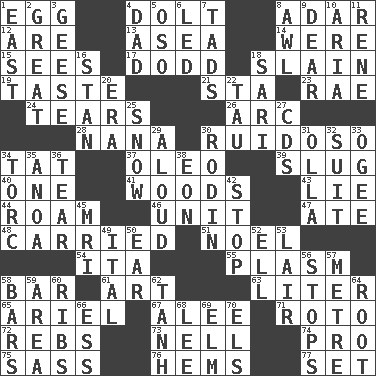 ACROSS 1. Ovum 4. Dunce 8. The sixth month of the Jewish calendar 12. "We ___ not amused" (Victoria) 13. Toward the sea 14. Past tense of be (plural) 15. Perceives with the eye 17. Texas town _ City 18. Killed 19. Clothes sense 21. R.R. building 23. Actress Charlotte 24. Lacerates 26. Curve 28. Grandmother 30. Boisterous (Brazilian Portuguese) 34. Make lace 37. Margarine 39. A hard, heavy blow 40. Single 41. Forest 43. Falsehood 44. Wander 46. A single undivided whole 47. Had dinner 48. Borne 51. Christmas carol 54. Call ___ day 55. Suffix with ecto or cyto 58. Tavern 61. Nonscientific branch of learning 63. 61 cubic inches 65. Satellite of Uranus 67. Toward shelter 71. Printing process, for short 72. Confederate soldiers (slang) 73. 1994 drama film starring Jodie Foster 74. Adept person 75. Backtalk 76. Cloth borders 77. Put into a specified state DOWN 1. 90 degrees 2. Relatively large 3. Honkers 4. Male parent 5. Bear (Spanish) 6. Directed 7. Bits 8. Leather borer 9. Letter starter 10. Roberta Peters solo 11. French philosopher Descartes 16. Comedian Laurel of Laurel & Hardy 18. Indian skirt 20. Epoch 22. The 19th letter of the Greek alphabet 25. Overwhelm 27. Music discs 29. Verbally 30. "The Thinker" sculptor 31. Spanish pot 32. Set or collection 33. Double curve, resembling the letter S 34. Torque (variant) 35. Small Philippine buffalo 36. Lacerate 38. A really long time 42. Obstruct or block passage 45. Medical imaging device (abbr.) 49. Slanted text style (abbr.) 50. Hearing organ 52. Pipe bend 53. Den 56. Ceases 57. Distance measurement (Brit.) 58. Long, evenly shaped pieces 59. Type of rug 60. Teases 62. Hyperbolic tangent 64. Carrot, for example 66. Double-curved letter 68. Area sheltered from the wind 69. Shade tree 70. Raised railways