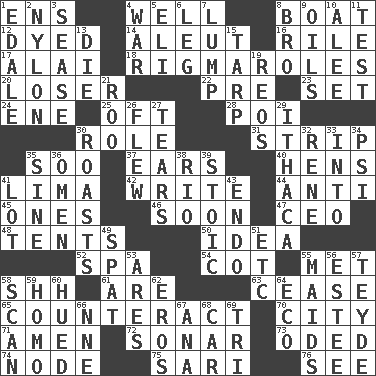 ACROSS 1. Followers of ems 4. Water source 8. Water vessel 12. Colored 14. Native American of Southwest Alaska 16. Cause heat under the collar 17. Mountain range southwest of Kyrgyzstan 18. Frustrating wastes of time 20. Failure 22. Before (prefix) 23. Arrange properly for use 24. Compass dir. 25. Often (poetically) 28. Luau course 30. Hero or heavy, e.g. 31. Remove all contents or possession from 35. "Barney Miller" actor Jack 37. Hearing organs 40. Coop moms 41. Pale green bean 42. Compose 44. Opposed to 45. Washington bills 46. Within a short period 47. Corporate head (abbr.) 48. Portable shelters 50. It may be bright or harebrained 52. Health resort 54. Small bed 55. Was introduced to 58. Quiet! 61. "We ___ not amused" (Victoria) 63. Stop 65. Neutralize 70. Municipality 71. So be it 72. Underwater navigation system 73. Wrote a lyric poem 74. Connecting point 75. Indian skirt 76. Perceive with the eye DOWN 1. Peak District village in England 2. Thermoplastic polyamide 3. Gospel singer Marvin 4. Armed conflict 5. Biblical high priest 6. Part of a journey 7. Mass 8. Sis' sibling 9. Lubricates 10. Toward shelter 11. Trial 13. Expire 15. Canvas cover 19. Vintage cars 21. Friend of Pooh 26. Soared 27. Pulls apart 29. New York city 30. Ridicules or criticizes harshly 32. French philosopher Descartes 33. To the inside or interior of 34. Air pressure measure (abbr.) 35. Trig term 36. Sign of things to come 38. _ de Janeiro 39. Unemotional 41. Car dealer's back yard 43. Inside; within (prefix) 49. Petty quarrel 51. And so on (abbr.) 53. Ancient Greek god of war 55. Women servants 56. First name in cosmetics 57. Miss Universe 1986, Barbara Palacios _ 58. Skim 59. Same (prefix) 60. Took on color 62. Greek god of love 64. Environmental prefix 66. Compass dir. 67. Santa ___, CA 68. Auto 69. Three (prefix)