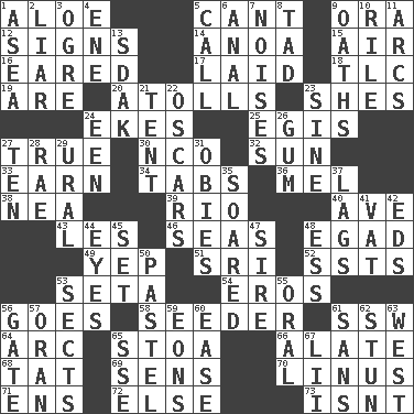 ACROSS 1. Medicinal plant 5. Patter 9. Mouth or opening 12. Signals 14. Small Philippine buffalo 15. Wind 16. Having ears or earlike features 17. Put down 18. Affectionate concern, for short 19. "We ___ not amused" (Victoria) 20. Ringlike coral islands and reefs 23. "______ My Girl" (Turtles hit) 24. Makes supply last 25. Armor plate that protects the chest 27. Loyal 30. Non-commissioned officer (abbr.) 32. Player for Phoenix 33. Merit 34. Bar bills 36. Cartoonist voice _ Blanc 38. Teachers' org. 39. River (Sp.) 40. "___ Maria" 43. French article 46. Oceans 48. Mild oath 49. Slangy assent 51. _ Lanka 52. Fast planes 53. Stalk of a moss capsule 54. Greek god of love 56. Moves 58. Sowing specialist 61. Compass dir. 64. Curve 65. Portico 66. Having winglike extensions 68. Make lace 69. Elected reps. 70. "_ and Lucy" (Charlie Brown theme song) 71. Followers of ems 72. Otherwise 73. Is not DOWN 1. At sea 2. One who doesn't tell the truth 3. Legendary monster 4. Compass dir. 5. Give a ring to 6. Of or related to the anus 7. Annoying sounds 8. Bit 9. Profane or obscene expressions 10. Cause heat under the collar 11. Arches 13. Neighbor of Neb. 21. Portable shelter 22. Motion picture awards 23. Trig term 24. Car or cant ending 26. Chewing product 27. Nine, plus one 28. Actress Charlotte 29. Mountain range 31. Off-Broadway awards 35. Flew 37. Straggles 41. Large container 42. Begley and Asner 44. Snake ____ (dice throw) 45. Put into a specified state 47. Male parent of an animal 48. Double-curved letter 50. Soft color 53. Religious groups 55. Relating to the mouth 56. Yard entry 57. Northwest Algerian city 59. Immeasurably long periods of time 60. Comfort 61. Without 62. Astound 63. Compass direction 65. Compass dir. 67. Cards in a Roman deck?