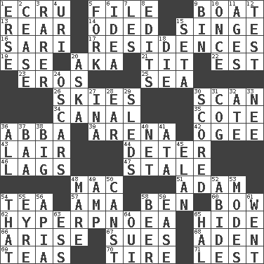 ACROSS 1. Shade of tan 5. Do some clerical work 9. Water vessel 13. Bring up, as a child 14. Wrote a lyric poem 15. Scorch 16. Indian skirt 17. Homes 19. Compass dir. 20. Alias (abbr.) 21. Teat (slang) 22. Eastern Standard Time (abbr.) 23. Greek god of love 25. Ocean 26. Atmospheres 30. Glance over 34. Lessep's creation 35. ____ d'Azur (French Riviera) 36. Swedish rock group 39. Sports stadium 42. Double curve, resembling the letter S 43. Den 44. Prevent from occurring 46. Fails to keep up a pace 47. Showing deterioration from age 48. Apple computer (short form) 51. First man 54. Afternoon social gathering 57. Nanny (var.) 58. Benjamin's nick name 60. Ribbon knot 62. Abnormally rapid or deep breathing 65. Flintstone garb 66. Originate 67. Institutes legal proceedings 68. An important port of Yemen 69. Beverages made from leaves 70. Hoop that covers a wheel 71. For fear that DOWN 1. Celtic language 2. Desist 3. Less widely known 4. RI univ. 5. Tined utensil 6. It may be bright or harebrained 7. French article 8. Proofreads 9. Storage container 10. Single time 11. Grows older 12. Trial 15. Stalk of a moss capsule 18. Pass on 20. "____ silly question..." 24. Motion picture awards 27. _ tizzy (2 wds.) 28. Ewer handle 29. Bobsleighs 30. Tallied 31. Gear tooth 32. Had dinner 33. Born 36. Everything 37. Sound made by sheep 38. Massive 40. Remaining after all deductions 41. _ moment's notice (2 wds.) 45. Enthusiasm 48. Female horse 49. Electrical Unit 50. 2nd pers. sing. pres. of can (arch.) 52. Stay 53. Methods 54. Not this but _ 55. Jane of fiction 56. Capital of Western Samoa 58. Fermented drink made from hops 59. Comfort 61. Left 63. Curvy letter 64. Fr. "Yes" 65. Actor Linden