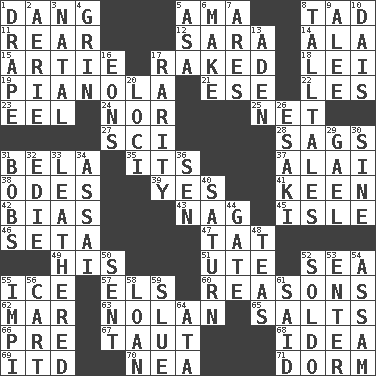 ACROSS 1. Mild oath, euphamism for damn 5. Nanny (var.) 8. Bit 11. Hitchcock's "____ Window" 12. "Two Mules for Sister ____" 14. Insect wing 15. Nick name for Arthur 17. Moved through 18. Flowery wreath 19. Player piano 21. Compass dir. 22. French article 23. Snakelike fish 24. And not 25. Remaining after all deductions 27. _-fi 28. Sinks 31. Actor Lugosi 35. ___ a Wonderful Life 37. Jai _ 38. Lyric poems 39. Affirmative reply 41. Peachy ____! 42. Prejudice 43. Tired old horse 45. Small island 46. Bristle 47. Make lace 49. Part of HMS, perhaps 51. Shoshoni 52. Ocean 55. Frozen water 57. Raised railways 60. Thinks logically 62. Impair 63. Pitcher Ryan 65. Table seasonings 66. Before (prefix) 67. Pulled tight 68. The main thing one is thinking about 69. It would 70. Teachers' org. 71. Dormintory (informal) DOWN 1. Window treatment 2. Nest on high 3. Relating to or accompanying birth 4. Amused look 5. White ___ sheet 6. Cause to be 7. Ancient Greek god of war 8. Baron Munchausen's specialties 9. Toward shelter 10. Raised platform 13. An important port of Yemen 16. Immeasurably long periods of time 17. Noteworthy scarcity 20. Locales 26. 1973 Nobel Price Winner (Physics) Leo 29. Highlander 30. Trig term 31. Moves up and down 32. Singer Brickell 33. Resembling or made to resemble leather 34. Slender Brazilian palm 36. Elected rep. 40. Titan orbits this 44. Yard entry 48. Afternoon social gatherings 50. Posted 52. Twentieth part of a lira 53. Keyboard key 54. Indian state 55. Body of Kaffir warriors 56. Heavy open wagon 58. Grant temporary use of 59. Turn sharply 61. Expressed in words 64. "One Day ___ Time"