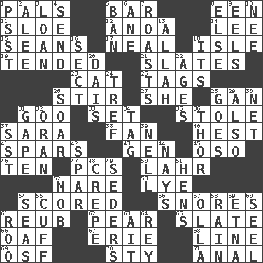 ACROSS 1. Friends 5. Long, evenly shaped piece 8. Car or cant ending 11. A type of plum 12. Small Philippine buffalo 14. Area sheltered from the wind 15. Actors Connery and Penn 17. Be tempered by heat 18. Small island 19. Watched over 21. Chalkboards 23. Domesticated feline 25. Labels 26. Commotion 27. A female animal or person 28. Separate the seeds from cotton 31. Thick or sticky substance 33. Put into a specified state 35. Took without asking 37. "Two Mules for Sister ____" 38. Avid follower 40. Command 41. Practice fights 43. Commissioned mil. rank 45. Bear (Spanish) 46. Nine, plus one 47. Personal Computers (abbr.) 50. Cowardly lion portrayer 52. Female horse 53. Potassium hydroxide 54. Tallied 56. Sounds asleep 61. Reuben's nickname 62. Lightbulb-shaped fruit 65. Schedule 66. Clumsy lout 67. One of the Great Lakes 68. Actor's bit 69. Order of Saint Francis (abbr.) 70. Filthy place 71. Of or related to the anus DOWN 1. Inconspicuous attention getter 2. Toward shelter 3. Grant temporary use of 4. Post 5. Forbid 6. One (Scot) 7. Ridicules or criticizes harshly 8. Otherwise 9. Snakelike fish 10. Born 13. Assad's deity 16. Religious group 18. It is 20. Raised platform 22. Grows older 24. Unclean, religiously 26. Fly high 28. Travels 29. In addition 30. Fish or hair follower 31. Yawn 32. Northwest Algerian city 34. Label 36. Son of Odin 37. Fast jet (abbr.) 39. 1994 drama film starring Jodie Foster 42. Coast Guard woman 44. Negative votes 48. Streamer paper 49. Spring feasts 51. Coop moms 52. Crowd into 54. Oceans 55. Sleeve end 57. Spanish pot 58. Water falling in drops from the sky 59. Inactive volcano in Sicily 60. Stitch closed the eyes of (a falcon) 61. Friend of Pooh 63. Small island 64. Marina Del _, California