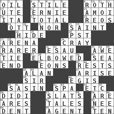 ACROSS 1. Petroleum 4. Vertical member of a panel or frame 9. Writer of Portnoy's Complaint (1969) 13. Shoshoni 14. Bert's buddy 15. Mine, in Marseilles 16. Call ___ day 17. Add up to 18. Vintage cars 19. Baseball player Mel 21. Not either 22. Virtuous person 24. Flintstone garb 26. Pacific Standard Time (abbr.) 27. Sports stadium 29. Supercomputer manufacturer 30. More uncommon 31. He sold his birthright 33. Deep reverence 36. Standoff 37. Shoved, as through a crowd 40. Ocean 41. Conclusion 42. Immeasurably long periods of time 43. Musical pauses 45. Actor Alda or Thicke 47. Originate 48. Title for a knight 49. The front part of a cuirass 50. Indian antelope 52. Health resort 54. And so on (abbr.) 56. "You Light Up My Life" star Conn 57. Narrow boards 59. "We ___ not amused" (Victoria) 61. Ancient Greek god of war 62. Lies 63. Born 64. Undesirable depression on a surface 65. Representative 66. Nine, plus one DOWN 1. Fr. "Yes" 2. "Tell ____ the Marines!" 3. Tough but pliablecoriaceous 4. Put into a specified state 5. Heavy duty weighing machine 6. To the inside or interior of 7. One who doesn't tell the truth 8. Snakelike fish 9. Noteworthy scarcity 10. Presage 11. A blast of a horn 12. Part of HMS, perhaps 20. Prong on a fork 22. Disorder 23. White ___ sheet 25. Have the gumption 27. Johnson of "Laugh-In" 28. Precipitation 29. Crow sounds 31. Inky black, to poets 32. Male child 33. Aide 34. Soaks 35. Relaxation 38. Memorize 39. To be drawn or hauled along 44. One of the Great Lakes 45. Aid 46. Cards in a Roman deck? 49. Consumed 50. Male parent of an animal 51. Arabian gulf 52. Volcanic refuse 53. Diluted with white 55. Algonquian 56. Male parent 57. R.R. building 58. Fast jet (abbr.) 60. Car or cant ending