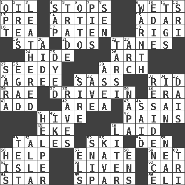 ACROSS 1. Lubricate 4. Halts 9. Soaks 13. Before (prefix) 14. Nick name for Arthur 15. The sixth month of the Jewish calendar 16. Afternoon social gathering 17. Eucharist need 18. Swiss mountan, "Queen of the Mountains" 19. R.R. building 21. Two (Sp.) 22. Makes less strong or intense 24. Flintstone garb 26. Nonscientific branch of learning 27. Morally degraded 29. Bowlike part 30. Match 31. Backtalk 33. To free from 36. Actress Charlotte 37. Popular '50s hangout 40. Period 41. Increase 42. Type of rug 43. Slender Brazilian palm 45. Hub of activity 47. Aches 48. Make supply last 49. Put down 50. Stories 52. What Jean-Claude Killy likes to do 54. Lair 56. Aid 57. Maternal 59. Fish or hair follower 61. Capri or Wight 62. Make or become more lively 63. Auto 64. Play the lead 65. Practice fights 66. Connecticut Ivy Leaguer DOWN 1. Choose 2. Angers 3. Resembling or made to resemble leather 4. Plant excrement 5. Barter 6. Von Bismarck 7. Sliced desserts 8. Elected rep. 9. Heat 10. Singer Brickell 11. Labels 12. Indian title of respect (Mr.) 20. Assistant 22. Tarsus (plural) 23. Curve 25. Colored 27. "Two Mules for Sister ____" 28. Mild oath 29. Toward the sea 31. Title for a man of rank and authority 32. "___ Maria" 33. Home 34. SW Asia republic 35. Raised platform 38. All-night dance parties 39. California wine valley 44. Expressed in words 45. Assistant 46. Mamie's husband 49. 61 cubic inches 50. Trial 51. Silent film actress Nazimova 52. Clip 53. Polynesian shrub of the pepper family 55. Anneal 56. Part of HMS, perhaps 57. Raised railways 58. Followers of ems 60. Three (prefix)