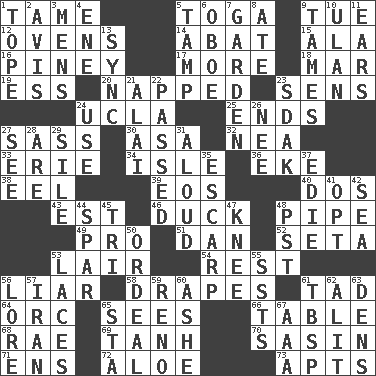 ACROSS 1. Docile 5. Ancient Roman robe 9. Third day of the wk. 12. Baking chambers 14. Blind as ____ 15. According to 16. Abounding in pines 17. Greater amount 18. Third mo. 19. Double-curved letter 20. Slept 23. Elected reps. 24. Southern CA. univ. 25. Extremities 27. Backtalk 30. White ___ sheet 32. Teachers' org. 33. 4th largest of the Great Lakes 34. Small island 36. Make supply last 38. Snakelike fish 39. Greek goddess of the dawn 40. Two (Sp.) 43. Eastern Standard Time (abbr.) 46. Evade 48. Corncob 49. Adept person 51. Daniel's nick name 52. Stalk of a moss capsule 53. Den 54. Relief 56. One who doesn't tell the truth 58. Window treatments 61. Small boy 64. The grampus (Milton) 65. Perceives with the eye 66. Eating place 68. Actress Charlotte 69. Hyperbolic tangent 70. Indian antelope 71. Followers of ems 72. Medicinal plant 73. Tenement units (abbr.) DOWN 1. Drink excessively 2. Advice 3. Not women's 4. Compass dir. 5. Pack (down) 6. Mitch Miller's instrument 7. Place where plants grow 8. Had dinner 9. Makes less strong or intense 10. Uhlan (variant) 11. Hearing organs 13. Synchronize (abbr.) 21. Mountain range southwest of Kyrgyzstan 22. Went by 23. Neighbor of Neb. 24. Purpose 26. Born 27. Perceive with the eye 28. "We ___ not amused" (Victoria) 29. Drop; flow; fall 31. Verbally 35. Fortification 37. Singer Brickell 41. Choose 42. Ocean 44. Coast Guard woman 45. Three (prefix) 47. Leg joint 48. Pacific Standard Time (abbr.) 50. Severe or trying experience 53. Shoestrings 55. Fast planes 56. Old wives' tales, e.g. 57. SW Asia republic 59. Western Nevada city 60. American tennis player Robert 61. Cook's measure (abbr.) 62. Came down and settled, as after flight 63. Hiding places for outlaws 65. R.R. building 67. American Automobile Association (abbr.)