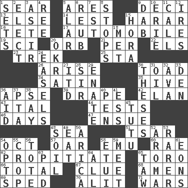 ACROSS 1. Dry up 5. Ancient Greek god of war 9. Tenth: prefix 13. Otherwise 14. For fear that 15. Ethiopian city, capital of Harari 16. False hair 17. Car 19. _-fi 20. Globe 21. For each 22. Raised railways 23. Long journey 25. R.R. building 26. Get up 30. Frog relative 34. Smooth fabric 35. Hub of activity 36. Domed church section 39. Window treatment 42. Liveliness 43. Slanted text style (abbr.) 44. Trials 46. 24-hour periods 47. Follow as a consequence or result 48. Ocean 51. Russian ruler of old 54. Sep. follower 57. Boat paddle 58. Australian flightless bird 60. Actress Charlotte 62. Conciliate 65. "Corrida" creature 66. "_____ Recall" 67. A slight indication 68. So be it 69. Moved rapidly 70. Set down 71. Armed conflicts DOWN 1. Puts into a specified state 2. Choose 3. Having gotten out of bed 4. To separate or throw off 5. Having or resembling wings 6. Reuben's nickname 7. Eastern Standard Time (abbr.) 8. Discontinues 9. Small moist lump or mass 10. 4th largest of the Great Lakes 11. Give a ring to 12. Angers 15. Israeli folk dance 18. Was introduced to 20. Gumbo ingredient 24. Artist's stands 27. It would 28. Title for a knight 29. Related on the mother's side 30. College papers 31. Petroleum 32. Actress Gardner 33. Lair 36. Help 37. Parent Teacher Assoc. 38. Declare 40. Writing instrument 41. Double-curved letter 45. Ballerina skirt 48. Land 49. Consume 50. N. Chile seaport 52. Scent 53. Less widely known 54. Chooses 55. Riding implement 56. Carry 58. Needle holder 59. Rendezvous 61. Immeasurably long periods of time 63. Writing tablet 64. 100% 65. The 23rd letter of the Hebrew alphabet
