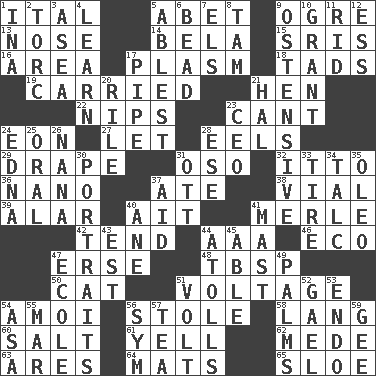 ACROSS 1. Slanted text style (abbr.) 5. Collude with 9. Legendary monster 13. Characteristic smell of wine 14. Actor Lugosi 15. Indian titles of respect 16. Type of rug 17. Suffix with ecto or cyto 18. Bits 19. Borne 21. Layer 22. Pinches, bites 23. Patter 24. Period of immesurable duration 27. Allow 28. Snakelike fish 29. Window treatment 31. Bear (Spanish) 32. "Tell ____ the Marines!" 36. Billionth: prefix 37. Had dinner 38. Small bottle 39. Having or resembling wings 40. Small island 41. Haggard of country music 42. Look after 44. Auto club (abbr.) 46. Environmental prefix 47. Celtic language 48. Cook's measure (abbr.) 50. Feline 51. Electrical Measurement 54. Mine, in Marseilles 56. Took without asking 58. Austrian-born American filmmaker Fritz 60. Table seasoning 61. Shout 62. Ancient Persian 63. Ancient Greek god of war 64. Floor protectors 65. _ gin DOWN 1. _ tizzy (2 wds.) 2. Torque (variant) 3. At sea 4. Acquire or gain knowledge or skills 5. Most capable 6. Necklace unit 7. Raised railways 8. Scottish cap 9. Clearly or manifestly demonstrative 10. Monetary aid 11. To free from 12. Double-curved letter 17. Corncob 20. Cause heat under the collar 21. Actor Linden 23. Corporate head (abbr.) 24. Pulitzer Prize-winning author Ferber 25. Spoken 26. Nanny 28. Compass dir. 30. Likenesses of persons 31. Baseball player Mel 33. Hoop that covers a wheel 34. Baby powder 35. Butter sub 37. Help 40. One (Scot) 41. Vertical spar for supporting sails 43. Eastern Standard Time (abbr.) 44. Ringlike coral islands and reefs 45. Competent 47. Learning spot: Fr. 49. Insides of hands 51. Electrical Unit 52. Highlander 53. Inside; within (prefix) 54. White ___ sheet 55. Impair 56. Symbol (abbr.) 57. Beverage made from leaves 59. Turn to the right