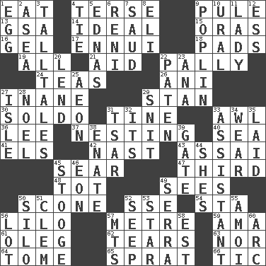 ACROSS 1. Ingest 4. Laconic 9. Whimper 13. Girls' org. (abbr.) 14. Standard of perfection 15. Mouths or openings 16. Set 17. World-weariness 18. Writing tablets 19. Everything 21. Assist 22. Friendly 24. Afternoon social gatherings 26. Black tropical American cuckoo 27. Silly 29. Comedian Laurel of Laurel & Hardy 30. Twentieth part of a lira 31. Prong on a fork 33. Leather borer 36. Area sheltered from the wind 37. Inhabiting a nest 40. Ocean 41. Raised railways 42. Political cartoonist Thomas 43. Slender Brazilian palm 45. Wither 47. One of three equal parts 48. Small child 49. Observes 50. Biscuitlike quick bread 52. Compass dir. 54. R.R. building 56. _ and Stitch 57. Distance measurement (Brit.) 59. Nanny (var.) 61. Cassini of fashion 62. Pulls apart 63. Not either 64. Heavy book 65. Small fatty European fish 66. Nervous spasm DOWN 1. Ovum 2. At sea 3. Baron Munchausen's specialties 4. Standoff 5. Ferber et al. 6. Painter Guido (1575-1642) 7. Saudi Arabian king (1953-1964) 8. Biblical high priest 9. Cotton for raincoats, e.g. 10. Mountain range 11. Kenny Rogers chart-topper in '80 12. Double-curved letter 20. Grant temporary use of 22. Eucharist need 23. Santa ___, CA 25. Period of immesurable duration 27. Capri or Wight 28. Christmas carol 29. In a ____ (agitated or irritated) 31. Russian ruler of old 32. ___ a Wonderful Life 33. Helper 34. Put on (as clothing) 35. Put down 38. Related on the mother's side 39. Yard entry 44. "______ My Girl" (Turtles hit) 45. Moe Howard, for one 46. A really long time 49. Father Junipero _ 50. Grain storage tower 51. Clement's nick name 52. Ooze 53. Play the lead 55. Mine, in Marseilles 56. Car dealer's back yard 57. Mountains (abbr.) 58. Eastern Standard Time (abbr.) 60. Curve