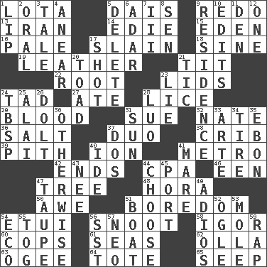 ACROSS 1. Globular water bottle used in Asia 5. Raised platform 9. Make new 13. SW Asia republic 14. Singer Brickell 15. Genesis locale 16. Diluted with white 17. Killed 18. Trig term 19. Cordwainer's material 21. Teat (slang) 22. Carrot, for example 23. Flaplike coverings 24. Small amount or degree 27. Had dinner 28. Louse (plural) 29. Vital fluid 31. Institute legal proceedings 32. Nathan's nickname 36. Table seasoning 37. Superhero pair 38. Baby bed with high sides 39. Essential or central part 40. Electrically charged atom 41. Paris' subway 42. Conclusions 44. Accounting whiz (abbr.) 46. Car or cant ending 47. Family _ (genealogy) 48. Israeli folk dance 50. Deep reverence 51. Mood resulting from idleness 54. Needle case 56. Snob 58. Composer Stravinsky 60. 911 reaches them 61. Oceans 62. Rounded earthenware pot or jar 63. Double curve, resembling the letter S 64. Carryall 65. Ooze DOWN 1. Mouth edge 2. Taken by mouth 3. Falsehood 4. Approach 5. Keyboard key 6. The sixth month of the Jewish calendar 7. One more than two 8. Elected rep. 9. Home 10. Prepares for publication 11. Lair 12. Single 17. Went for two points 20. Frog relative 21. Nervous spasm 23. Falsehood 24. Cook's measure (abbr.) 25. Jai ____ 26. Stupid person 28. Nilotic language 30. Else 31. Player for Phoenix 33. Johnson of "Laugh-In" 34. Become fatigued 35. Inky black, to poets 37. Two (Sp.) 40. Binary compound 41. Female horse 43. Born 44. Elect 45. Left side of a ship or aircraft 47. Grayish beige 49. Goodbye (Sp.) 51. Water vessel 52. Stare at amorously 53. Undercover agent 54. Environmental prefix 55. Coat; cloak 56. Fast jet (abbr.) 57. Modern: prefix 59. Reproach for some lapse or misdeed