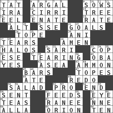 ACROSS 1. Make lace 4. Therefore, facetiously 9. Sty mamas 13. Lyricist Gershwin 14. High-altitude cloud 15. Relationship diagram 16. Snakelike fish 17. Maternal 18. Assign a rank or rating to 19. Keyboard modifier key 21. Compass dir. 22. Scores awarded for successful feats 24. Drink excessively 26. Cuckoo 27. Lacerates 29. So be it 30. Saint headwear 31. Indian skirt 33. Police officer (slang) 36. Compass dir. 37. Pulling apart 40. Chief or king in Benin or Nigeria 41. Affirmative reply 42. Toward the sea 43. ID or VA city 45. Long, evenly shaped pieces 47. Drinks excessively 48. Had dinner 49. Do over again 50. Vegetable dish 52. Adept person 54. Conclude 56. Transmitted 57. Gives food to 59. Sight organ 61. Afternoon social gatherings 62. Indian princess (variant) 63. Compass dir. 64. Silent film actress Nazimova 65. Greek mythologigal hunter 66. "___ Little Indians" DOWN 1. Standoff 2. Length times width 3. Baron Munchausen's specialties 4. Adept person 5. Remove soap 6. Pate de foie ____ 7. Johnson of "Laugh-In" 8. Untruth 9. Put through a sieve 10. Taken by mouth 11. Soaks 12. Observe 20. "Corrida" creature 22. Street urchin 23. Single 25. Inconspicuous attention getter 27. Those people 28. Relaxation 29. Roberta Peters solo 31. Backtalk 32. "We ___ not amused" (Victoria) 33. Piece 34. Mitch Miller's instrument 35. Baking dishes 38. Having ears or earlike features 39. Yard entry 44. Method 45. Greek mezzo-soprano Agnes 46. _ moment's notice (2 wds.) 49. Cowboy competition 50. Stitch closed the eyes of (a falcon) 51. Of or related to the anus 52. Lightbulb-shaped fruit 53. Painter Guido (1575-1642) 55. Centimeter-gram-second unit of force 56. R.R. building 57. Away 58. Elected rep. 60. Car or cant ending