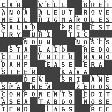 ACROSS 1. Auto 4. Water source 8. Cy Young winner Saberhagen 12. Small Philippine buffalo 14. Native American of Southwest Alaska 16. Be footloose 17. Famous astronaut Armstrong 18. Frustrating wastes of time 20. First course 22. Before (prefix) 23. Eastern Standard Time (abbr.) 24. Attempt 25. RI univ. 28. Nervous spasm 30. Part of speech 31. Olfactory organs 35. R.R. building 37. Put down 40. Redecorate 41. Hoof sound 42. Keyboard key 44. Billionth: prefix 45. Moist 46. Relaxation 47. Epoch 48. Bull 50. Polynesian shrub of the pepper family 52. Morning condensation 54. _ Lanka 55. One (Scot) 58. Health resort 61. ___ Haven, CT 63. Nothings 65. Parts 70. Prepare for publication 71. At sea 72. Off limits 73. Olfactory organ 74. Look after 75. Straggles 76. To separate or throw off DOWN 1. 2nd pers. sing. pres. of can (arch.) 2. Approach 3. Turbulent 4. Armed conflict 5. Connecticut Ivy Leaguer 6. Part of a journey 7. Mass 8. Sis' sibling 9. Hero or heavy, e.g. 10. Nights before holidays 11. Trial 13. According to 15. Small pie 19. It's straight from the horse's mouth 21. Superhero pair 26. General guideline 27. Empty; void 29. Pupil covering 30. Slept 32. Wither 33. Pulitzer Prize-winning author Ferber 34. "Barney Miller" actor Jack 35. Narrow board 36. Heavy book 38. Call ___ day 39. Writing tables 41. Music discs 43. Stern 49. Former U.S. Attorney General Janet 51. To wit 53. Gone 55. Zeal 56. Annoying sound 57. First name in cosmetics 58. Leave at once 59. Introduce or present, as a question 60. So be it 62. Welt 64. Car or cant ending 66. Groovy apt. 67. Basketball assoc. 68. Coat; cloak 69. Mayday