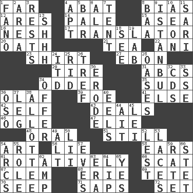 ACROSS 1. At a great distance 4. Blind as ____ 8. Prejudice 12. Ancient Greek god of war 14. Light colored 15. Toward the sea 16. Delicate 17. Interpreter 20. Pledge 21. Beverage made from leaves 22. Cuckoo 23. Chest covering 27. Inky black, to poets 29. Become fatigued 31. Lettered men learn these first 34. More peculiar 35. Soap bubbles 36. Norwegian king 39. Enemy 41. Otherwise 42. Automatically 43. Allots cards 46. Stare at amorously 47. Writer Wiesel 48. Relating to the mouth 51. Not moving 54. Tate display 56. Whopper 58. Hearing organs 61. Producing rotation 66. Jazz singing style 67. Clement's nick name 68. One of the Great Lakes 69. False hair 70. Ooze 71. Plant excrements 72. Arrange properly for use DOWN 1. Papal veil 2. Type of rug 3. Musical pauses 4. Fitting 5. Long, evenly shaped piece 6. In the manner of 7. Portable shelter 8. Sound made by sheep 9. Byzantium, centuries later 10. Period of immesurable duration 11. Indian skirt 13. Quiet! 18. Observe 19. Experiment locale 24. It would 25. To free from 26. Unclean, religiously 28. Fertile tracts in a desert 30. Eat (away) 32. Music discs 33. Compass dir. 34. Auction bid 36. Bear (Spanish) 37. Part of a journey 38. One to whom something is allotted 40. Snakelike fish 44. Small island 45. Flowery wreath 49. Keyboard modifier key 50. Cards in a Roman deck? 52. For fear that 53. Shoestrings 54. Arches 55. Hero or heavy, e.g. 57. Nights before holidays 59. Pace 60. Proofreading order 62. Electrical Unit 63. Epoch 64. Mouth edge 65. It is so