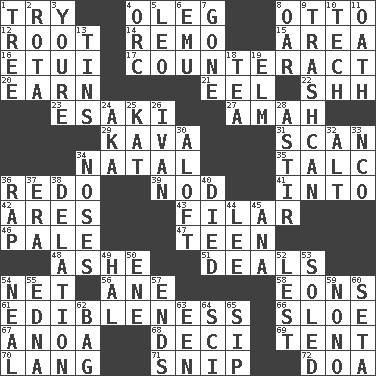 ACROSS 1. Attempt to accomplish something 4. Cassini of fashion 8. "Beetle Bailey" pooch 12. Carrot, for example 14. San ____ (Riviera town) 15. Length times width 16. Needle case 17. Act in opposition 20. Merit 21. Snakelike fish 22. Quiet! 23. 1973 Nobel Price Winner (Physics) Leo 27. Housemaid 29. Polynesian shrub of the pepper family 31. Examine minutely or intensely 34. Brizilian seaport 35. Baby powder 36. Make new 39. Dreamland 41. To the inside or interior of 42. Ancient Greek god of war 43. Having threads 46. Light colored 47. Adolescent 48. American tennis player Robert 51. Allots cards 54. Remaining after all deductions 56. One (Scot) 58. Immeasurably long periods of time 61. The property of being fit to eat 66. _ gin 67. Small Philippine buffalo 68. Tenth: prefix 69. Portable shelter 70. Austrian-born American filmmaker Fritz 71. Clip 72. ___ good deed DOWN 1. Relationship diagram 2. Round or rotation of duties 3. You are 4. The grampus (Milton) 5. Lion 6. Australian flightless bird 7. Went 8. Rowing implement 9. File 13 10. Georgia ____ (Atlanta school) 11. Pledge 13. Airtight sealed metal containers 18. Afternoon social gathering 19. Shade tree 24. Alias (abbr.) 25. Krazy ___ of comics 26. _ the terrible 28. Being in motion 30. At or to great height 32. Keyboard modifier key 33. Non-commissioned officer (abbr.) 34. Olfactory organs 36. Hit sharply and swiftly 37. Period 38. Accusation by an informer 40. Passed on 44. Area sheltered from the wind 45. Santa ___, CA 49. Actor Linden 50. Compass dir. 52. For fear that 53. Having a sole or soles 54. Actress Patricia 55. Pulitzer Prize-winning author Ferber 57. Conclusions 59. Words to Nanette 60. Bristle 62. Paper or plastic container 63. Car or cant ending 64. _-fi 65. Small drink
